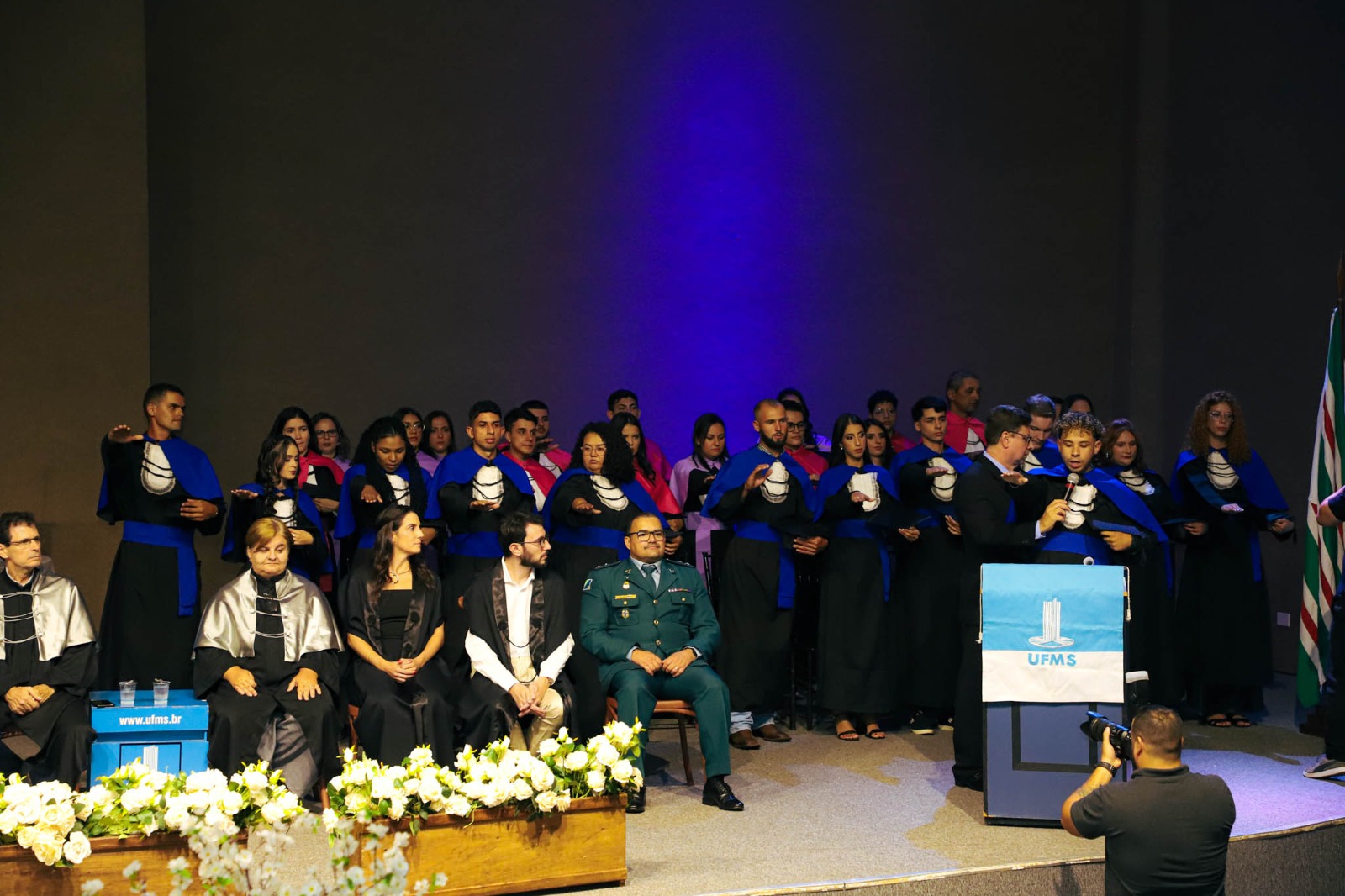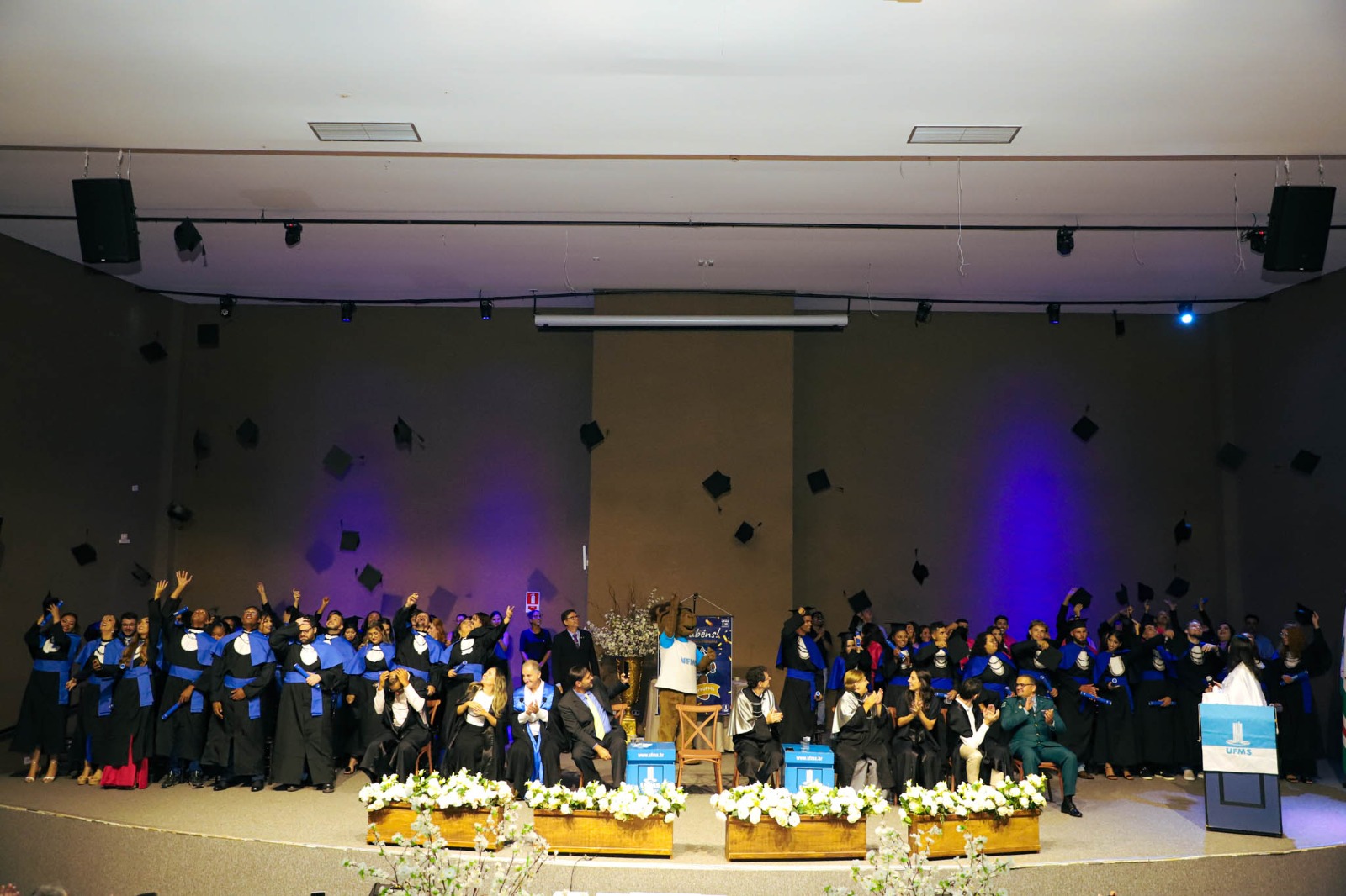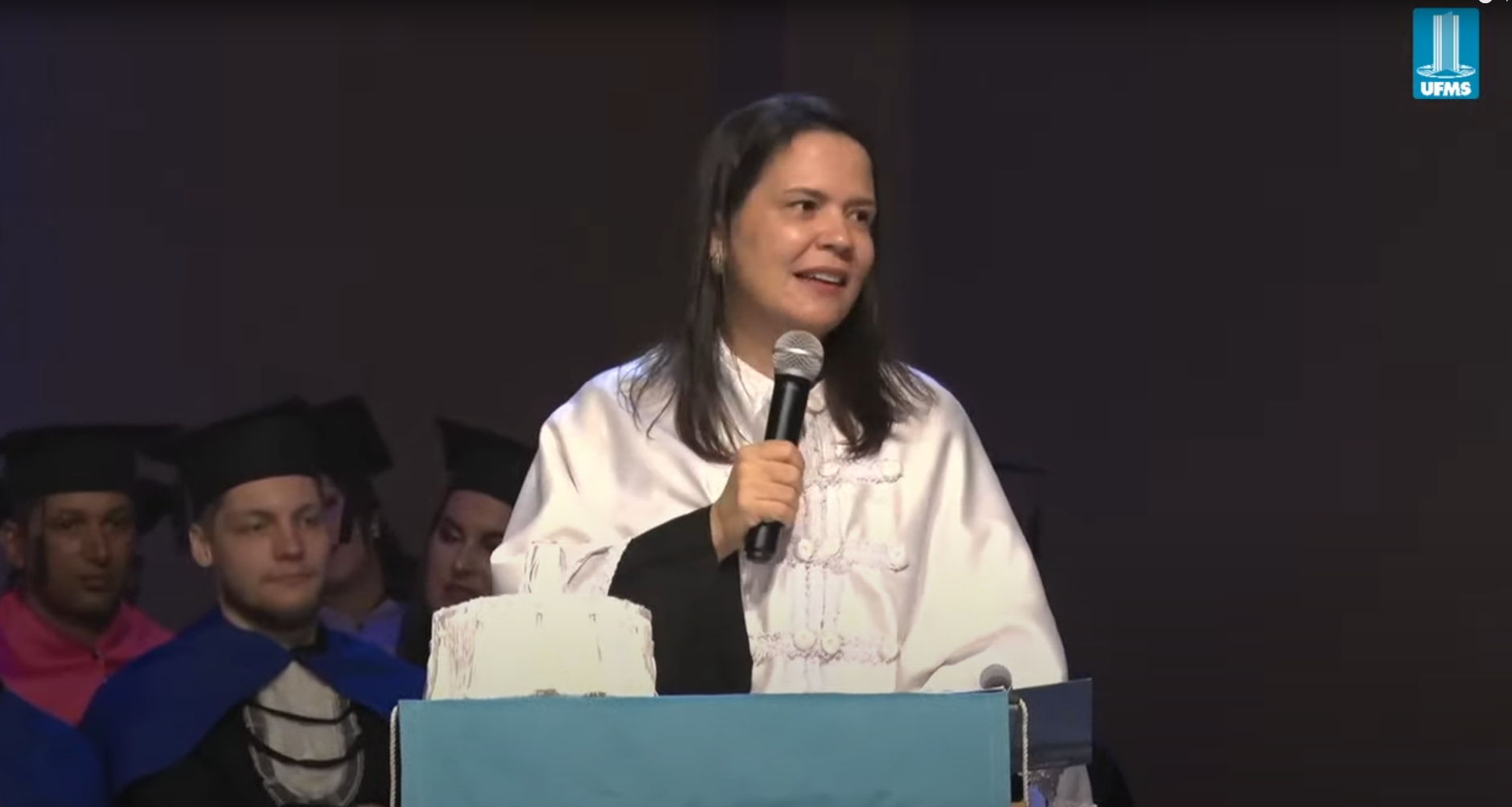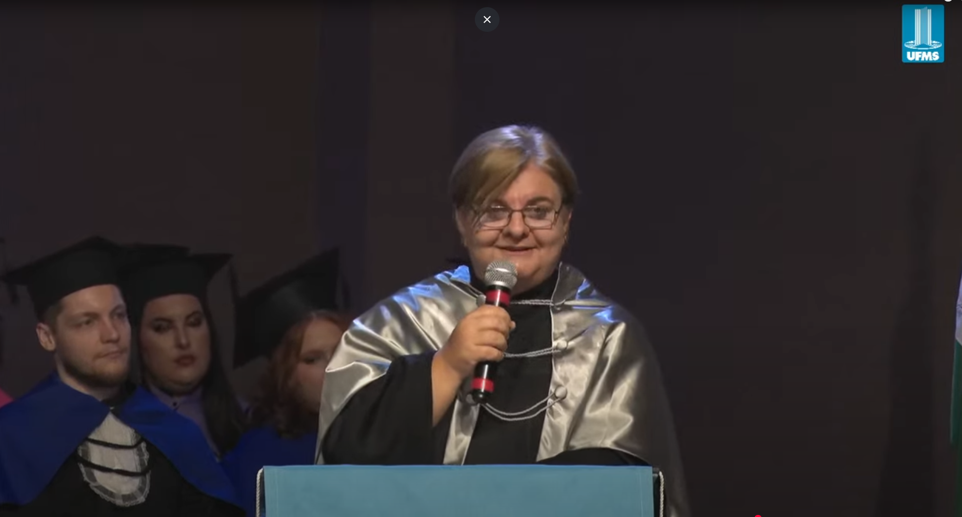 A reitora Camila Ítavo destacou a importância do momento e relembrou a trajetória dos formandos. “Vocês entraram como estudantes e saem como egressos, prontos para novos desafios. Esta é uma grande realização, fruto da dedicação de vocês e do compromisso da nossa Universidade. Gostaria que se lembrassem do momento em que receberam a notícia de que foram aprovados na melhor Universidade. A emoção daquele dia se reflete agora, neste instante de conquista. […] Hoje é um dia para celebrar! Vocês representam muitos sonhos: os seus e os de suas famílias. Somos o resultado daquilo que sonhamos, daquilo que perseguimos com esforço e dedicação. Lembrem-se sempre das pessoas que estiveram ao seu lado nesta caminhada. Reconheçam a importância do papel que assumem a partir de agora. Que vocês busquem sempre ser a melhor versão de si mesmos. Nunca percam a oportunidade de aprender, de crescer e de se reinventar. Vocês são o nosso orgulho! Brilhem sempre! Para sempre UFMS!”, comemorou.