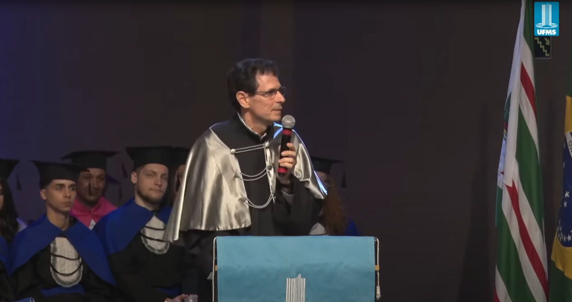O vice-reitor Albert Schiaveto também deixou sua mensagem. “É com muito orgulho que celebramos o sucesso de estudantes vindos de todo o Brasil. É uma grande alegria ser parte da UFMS. Hoje, vocês acordaram como alunos e vão dormir como profissionais. Vocês fazem parte da nossa família: uma vez UFMS, sempre UFMS. Agradeço imensamente aos pais que apoiaram seus filhos ao longo dessa trajetória. Continuem ao lado deles, oferecendo suporte e orientação, pois a caminhada não termina aqui. […] O papel de vocês é transformar o mundo e é com essa responsabilidade que vocês partem para novos desafios. Onde quer que estejam, levem o nome da nossa UFMS com orgulho. Parabéns formandos!”, disse.