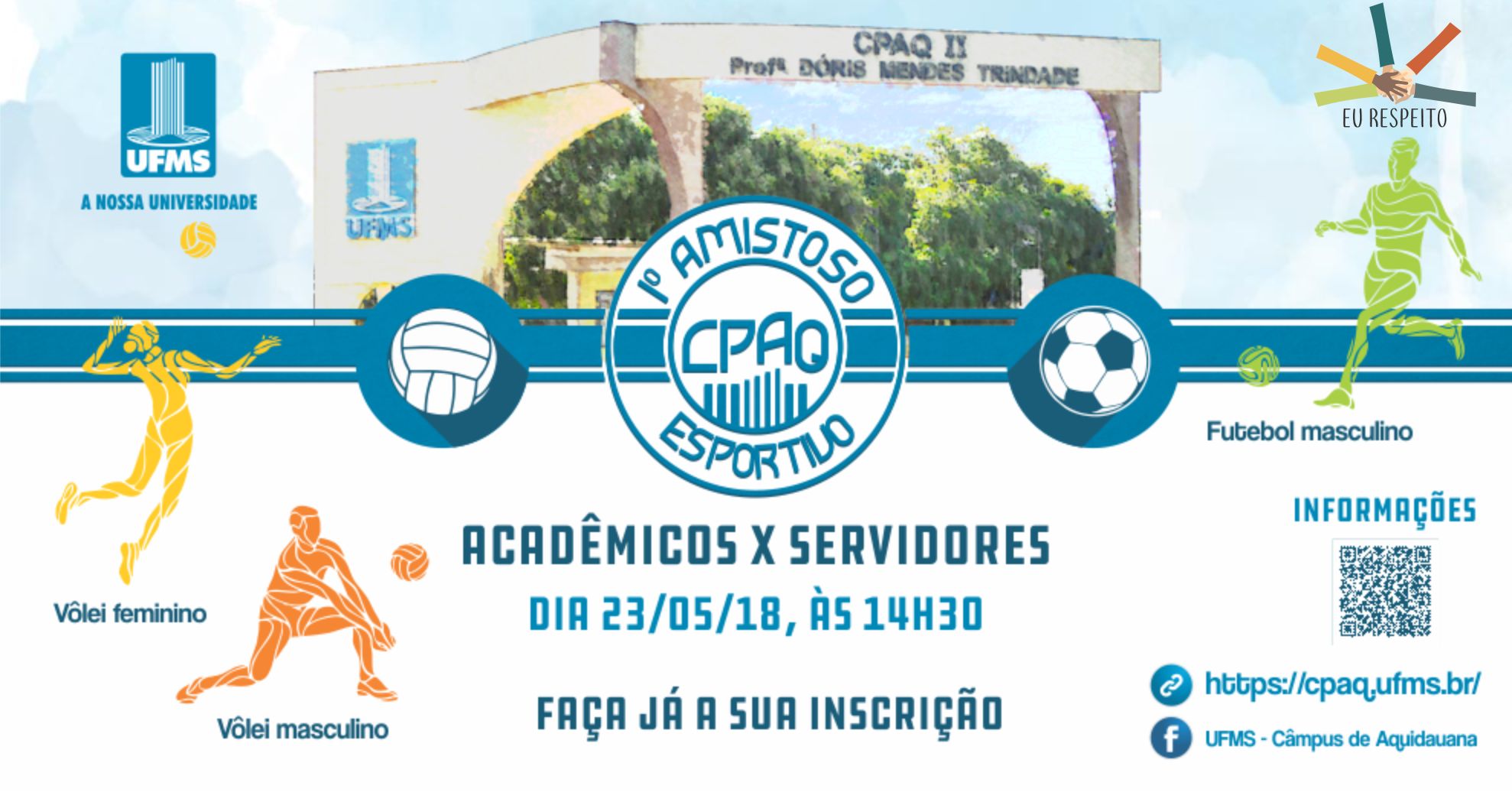 Com o objetivo de promover a integração da comunidade acadêmica o Câmpus de Aquidauana (CPAQ) realiza no dia 23 de maio o “I Amistoso Esportivo do CPAQ – acadêmicos x servidores”. A atividade faz parte da campanha “Eu respeito”, que em maio tem como tema a Universidade, os servidores e bens patrimoniais.