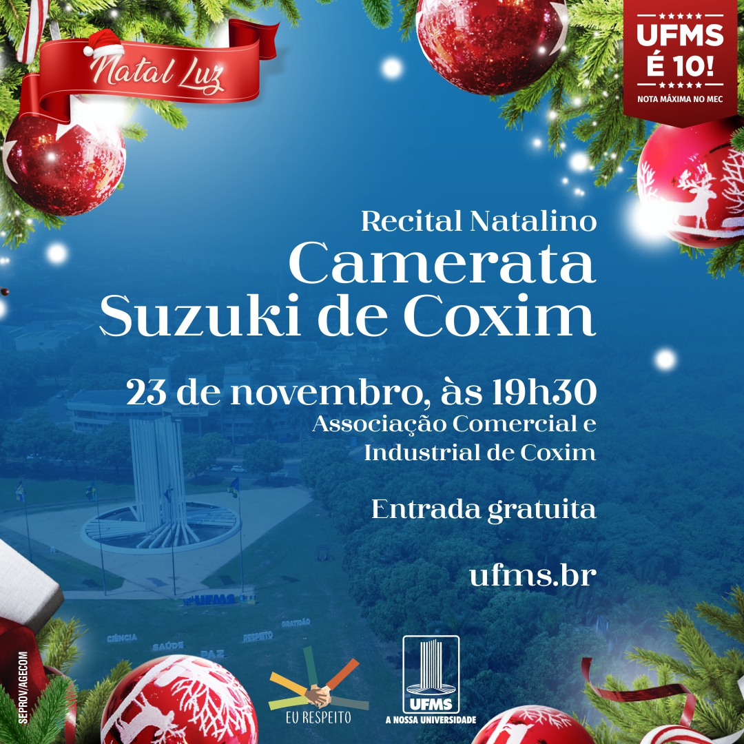 A Camerata Suzuki de Coxim, projeto de extensão do Câmpus de Coxim, realizará o recital natalino com a participação especial do professor e violinista Mateus Tonette, nesta quinta-feira, 23. A apresentação inicia às 19h30, na Associação Comercial e Industrial de Coxim, e faz parte do encerramento das atividades do ano. Toda a comunidade está convidada a participar e a entrada é gratuita.