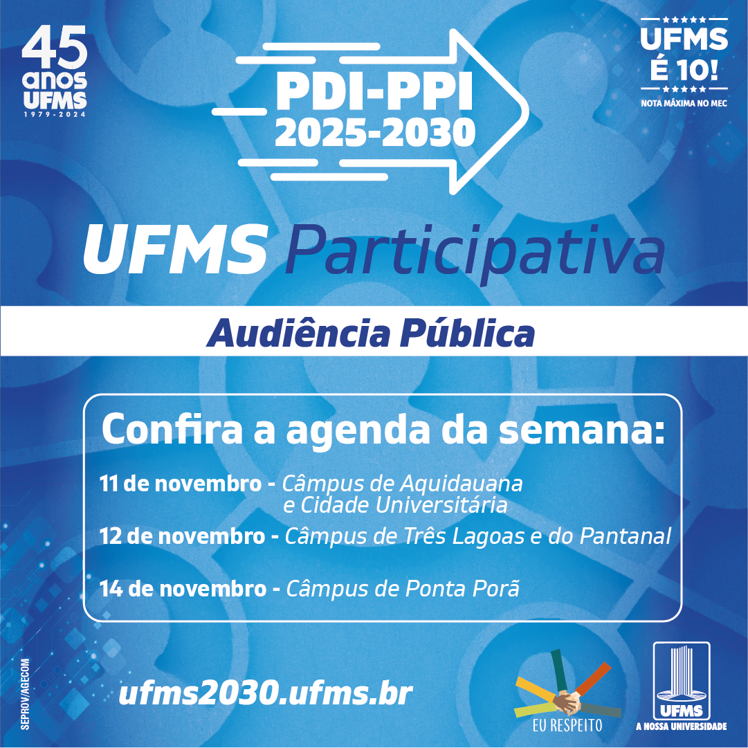 O objetivo é apresentar a plataforma digital ufms2030.ufms.br e incentivar o envio e apoio de propostas para a construção do novo Plano de Desenvolvimento Institucional (PDI) de 2025 a 2030, integrado ao Projeto Pedagógico Institucional (PPI) da Universidade. A ação é inspirada no modelo de trabalho adotado pelo Plano Plurianual Participativo do Governo Federal.