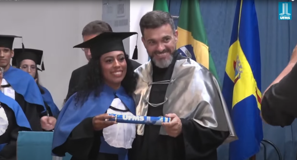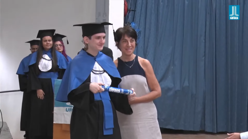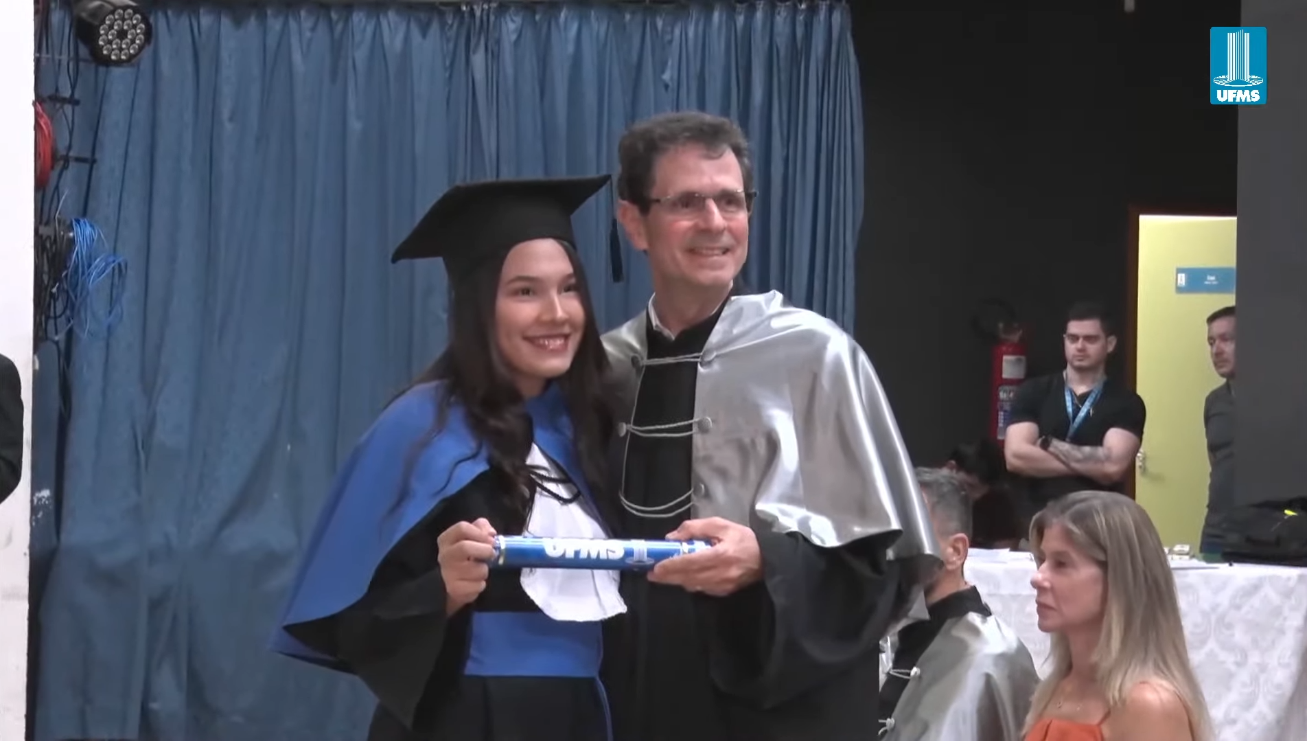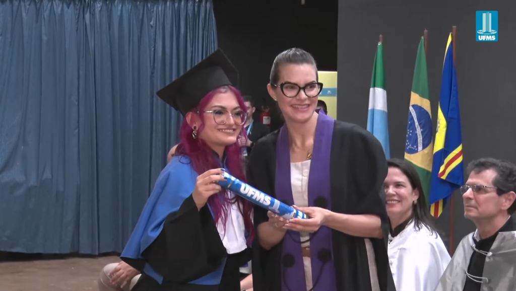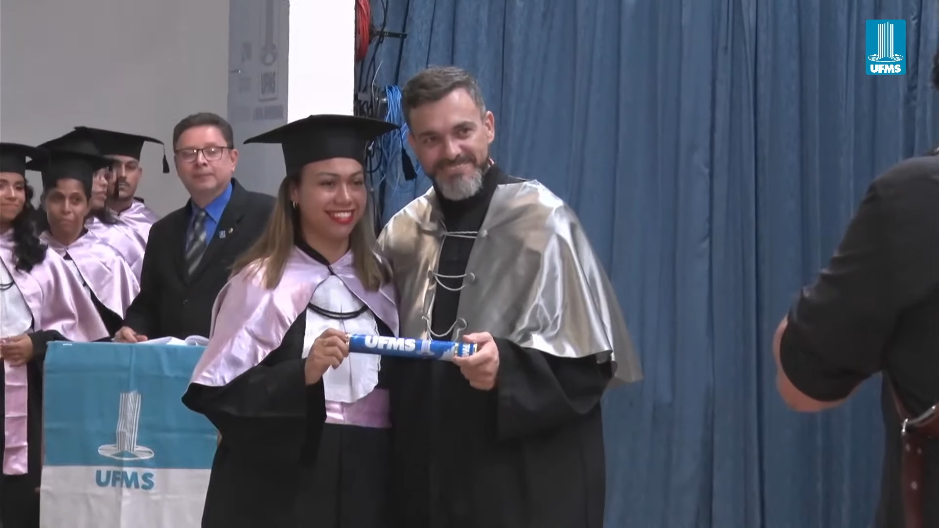 A bacharel em Psicologia Nataly Canteri discursou em nome de todos os formandos e expressou a gratidão pela jornada vivida e pelo apoio recebido ao longo do curso. “Hoje é um dia que simboliza esforço, superação e inspiração. É o resultado de anos de trabalho e dedicação. Nunca imaginamos que nossa trajetória seria marcada por tantos desafios e obstáculos. Durante a pandemia, aprendemos a lidar com o novo, mesmo quando tudo parecia incerto. Ao olharmos para trás, é possível ver quem esteve ao nosso lado: família, amigos, familiares e, principalmente, nossos professores, que foram fundamentais nessa caminhada. Essa conquista é fruto do esforço de cada um de nós. Temos o privilégio de nos formar na UFMS, no CPan. Nossa jornada de aprendizado nunca termina. A formatura é apenas uma etapa, uma celebração de tudo que já conquistamos, mas também um lembrete de que o conhecimento é infinito e que sempre haverá algo a mais para aprender. Que o futuro seja brilhante para todos nós e que venham os próximos desafios. Parabéns a todos nós!”, comemorou.
