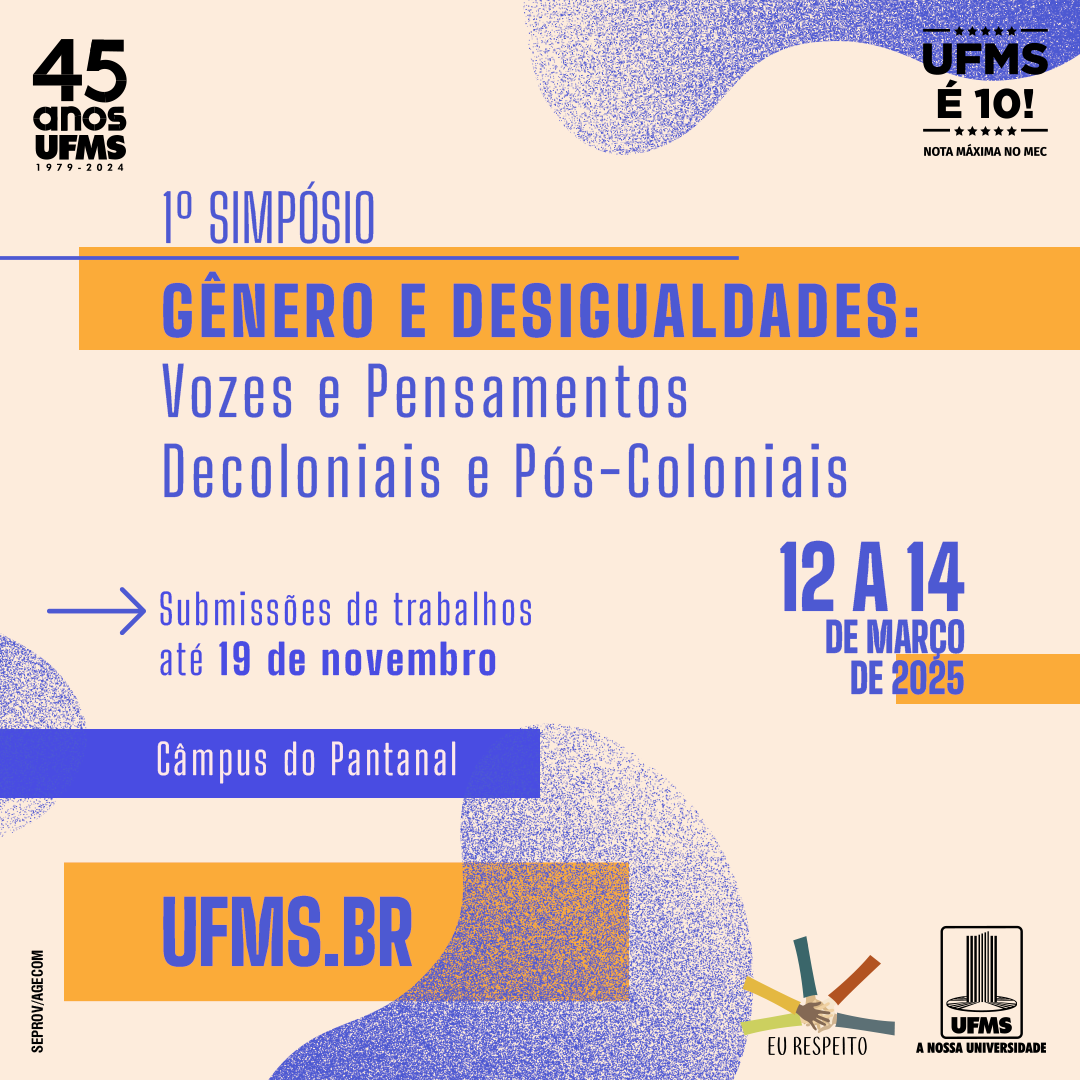 Estão abertas as submissões de trabalhos para o 1° Simpósio de Gênero e Desigualdades: Vozes e Pensamentos Decoloniais e Pós-Coloniais. O evento será promovido de 12 a 14 de março de 2025, no Câmpus do Pantanal (CPan), e reunirá pesquisadores que discutem as múltiplas desigualdades que afetam a população corumbaense e fronteiriça. Os interessados devem se inscrever até 19 de novembro nesta página.