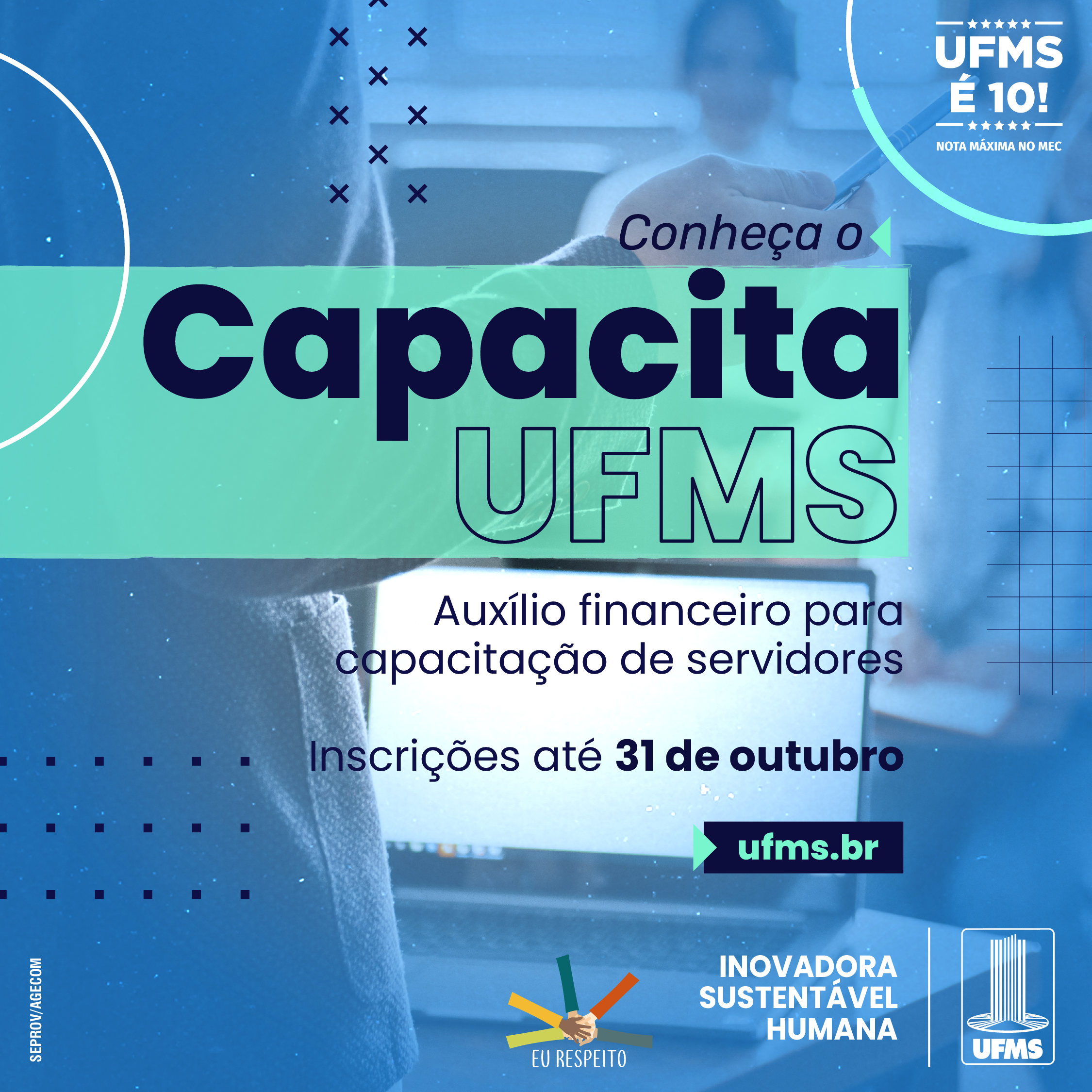 Com foco no fortalecimento do Plano de Desenvolvimento de Pessoas da Universidade, o Capacita UFMS oferece apoio financeiro individual ou coletivo para realização de capacitações técnicas ou treinamentos para servidores. Ao todo, serão investidos R$ 150 mil no aperfeiçoamento de professores e técnicos-administrativos da Instituição, de acordo com as necessidades das unidades da Administração Central e Setorial. As inscrições devem ser feitas até 31 de outubro no Sistema de Informação e Gestão de Projetos (Sigproj).