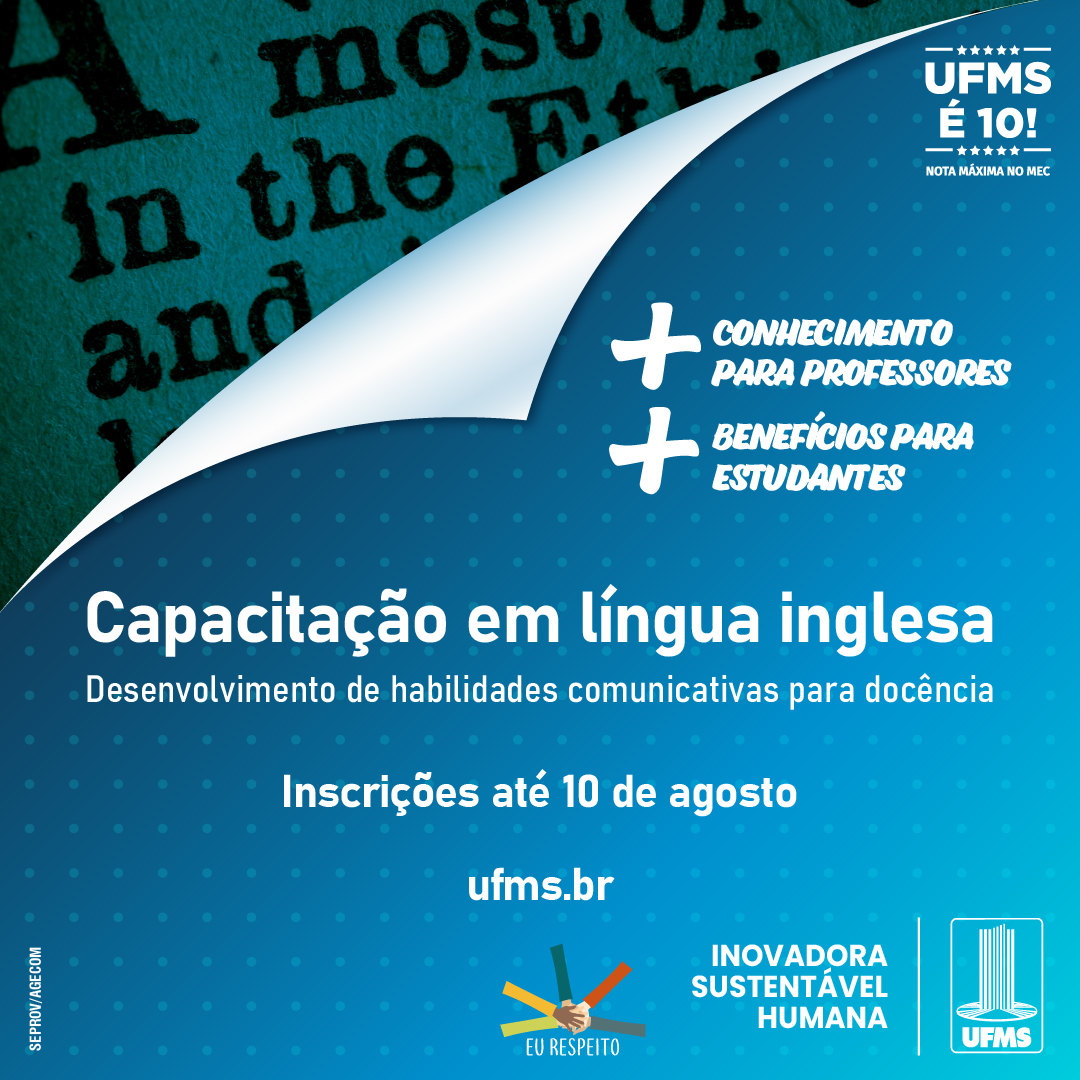 Até o dia 10 de agosto, professores de cursos de graduação e pós-graduação de todas as áreas de conhecimento da UFMS podem se inscrever para capacitação em língua inglesa, voltada para o desenvolvimento de habilidades comunicativas para a docência. O curso é oferecido por meio de ação conjunta da Universidade com a Regional English Language Officer da Embaixada dos Estados Unidos no Brasil. Para participar, é necessário preencher formulário on-line no Sistema de Informação e Gestão de Projetos.