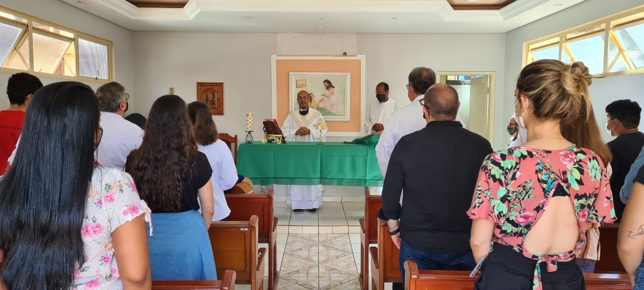 A capela do Hospital Universitário Maria Aparecida Pedrossian (Humap-UFMS Ebserh) recebeu, na tarde de ontem, 20, a primeira missa após a suspensão das atividades presenciais em função da pandemia da Covid-19. O reitor da UFMS, Marcelo Turine, esteve presente durante a celebração presidida pelo pároco Idenilson Lemes da Conceição, que é pró-reitor de Pastoral e Assuntos Comunitários da Universidade Católica Dom Bosco (UCDB). A capela do Humap-UFMS Ebserh está integrada à Paróquia Universitária São João Bosco, localizada na UCDB.
