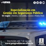 A especialização em Gestão em Segurança Pública da UFMS recebe inscrições para oportunidades remanescentes nos polos de Bonito, Corumbá, Coxim