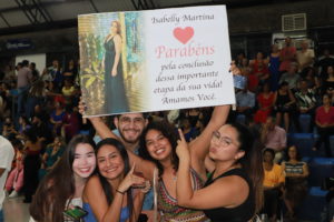 A paraninfa da turma de Medicina Veterinária, a professora Larissa Gabriela Ávila discursou em nome dos docentes homenageados da noite. “Hoje é um dia muito importante na vida de vocês. Cada um enfrentou vários obstáculos para chegar até aqui, foram noites sem dormir, dias de choro, saudades de casa, e hoje estão aqui celebrando essa conquista. Eu desejo o mundo para vocês e lembrem-se que o mundo não tem limites. Vocês são capazes de tudo, não há fronteiras, mesmo que exista o medo, sigam em frente”, aconselhou.