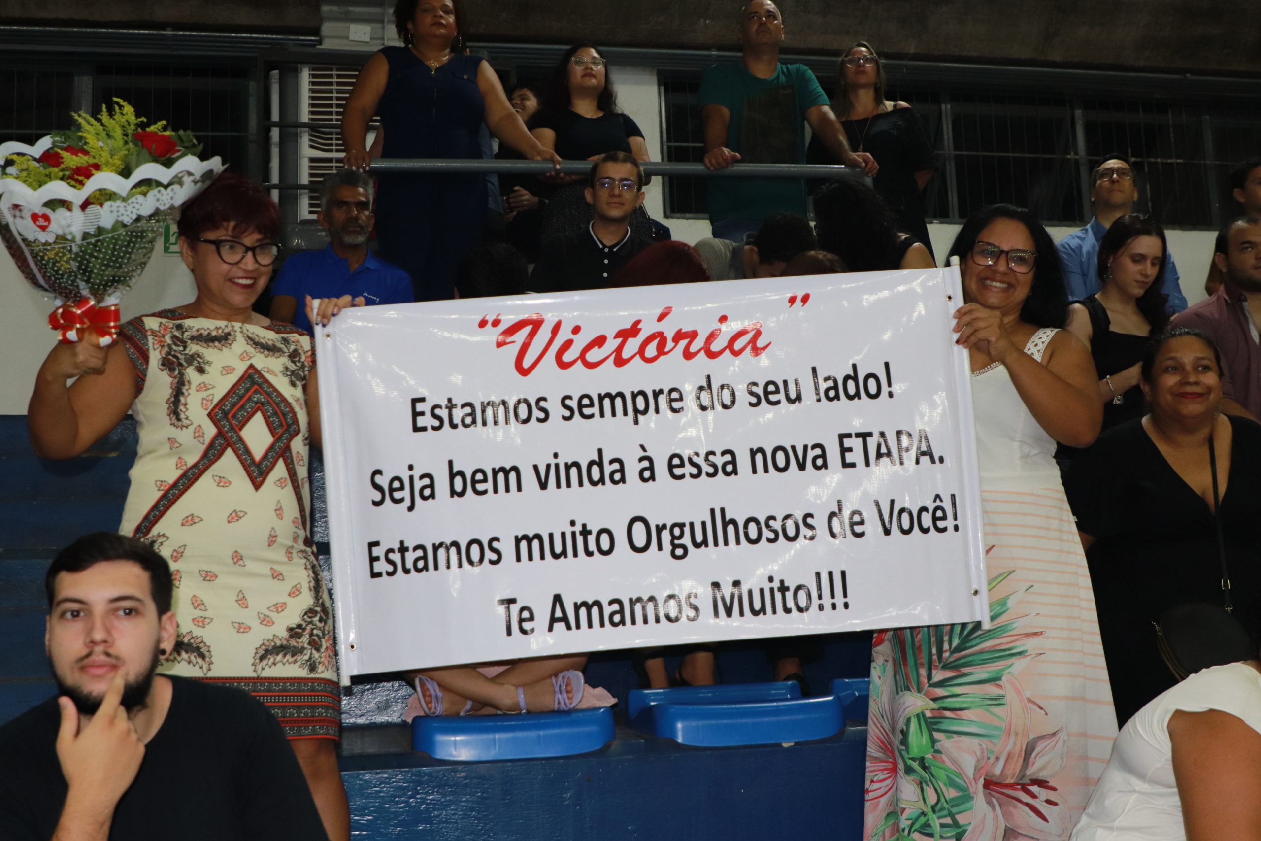 A paraninfa da turma de Medicina Veterinária, a professora Larissa Gabriela Ávila discursou em nome dos docentes homenageados da noite. “Hoje é um dia muito importante na vida de vocês. Cada um enfrentou vários obstáculos para chegar até aqui, foram noites sem dormir, dias de choro, saudades de casa, e hoje estão aqui celebrando essa conquista. Eu desejo o mundo para vocês e lembrem-se que o mundo não tem limites. Vocês são capazes de tudo, não há fronteiras, mesmo que exista o medo, sigam em frente”, aconselhou.