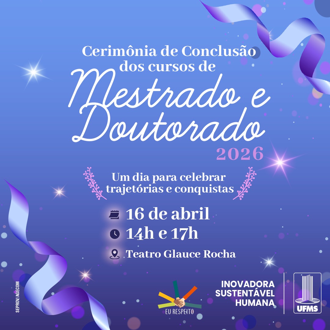 No dia 16 de abril, duas cerimônias marcam a titulação de aproximadamente 260 pós-graduandos, entre mestres e doutores, de diferentes unidades acadêmicas. As solenidades serão realizadas no Teatro Glauce Rocha, com transmissão ao vivo pela TV UFMS, ampliando o acesso de familiares e da comunidade à conclusão de mais uma etapa na trajetória acadêmica dos estudantes.