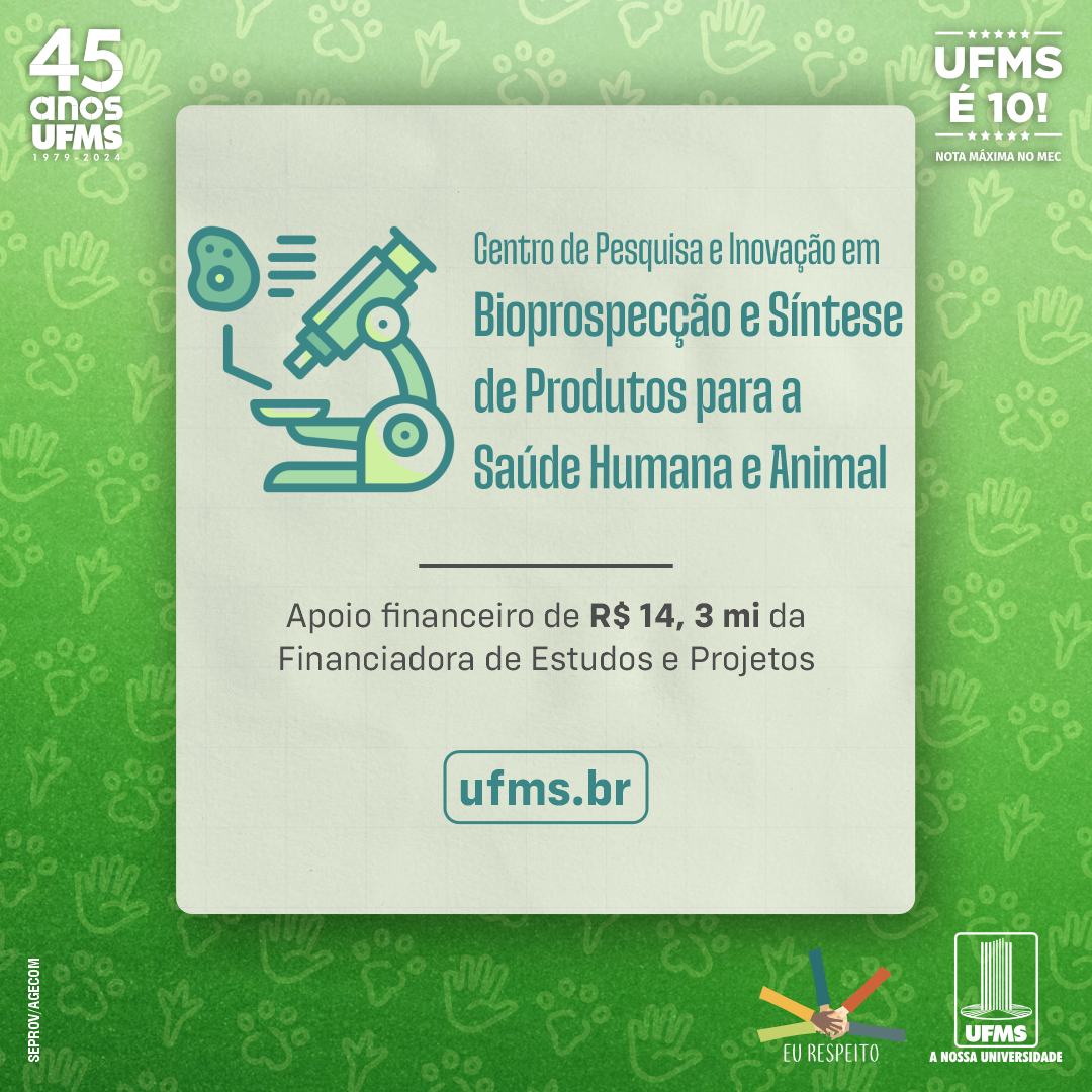 Uma proposta da UFMS foi aprovada na chamada da Financiadora de Estudos e Projetos (Finep) para a consolidação de um centro multiusuário temático na área da saúde. O projeto intitulado Centro de Pesquisa e Inovação em Bioprospecção e Síntese de Produtos para a Saúde Humana e Animal tem como objetivo viabilizar soluções inovadoras para desafios críticos na área, promovendo impacto direto no bem-estar humano. Serão destinados cerca de R$14,3 milhões para a modernização dos equipamentos e garantia da sustentabilidade e operacionalidade dos laboratórios associados ao projeto.