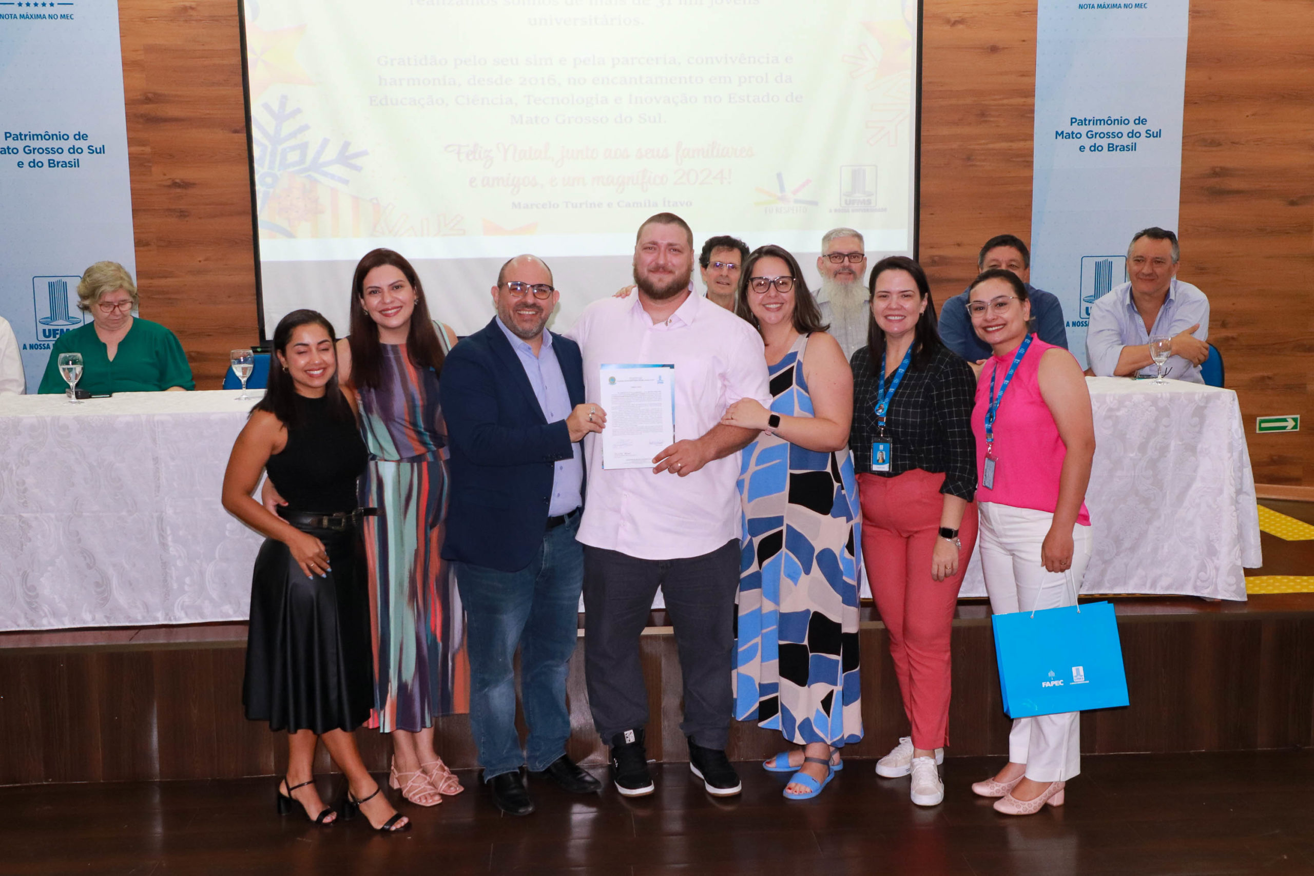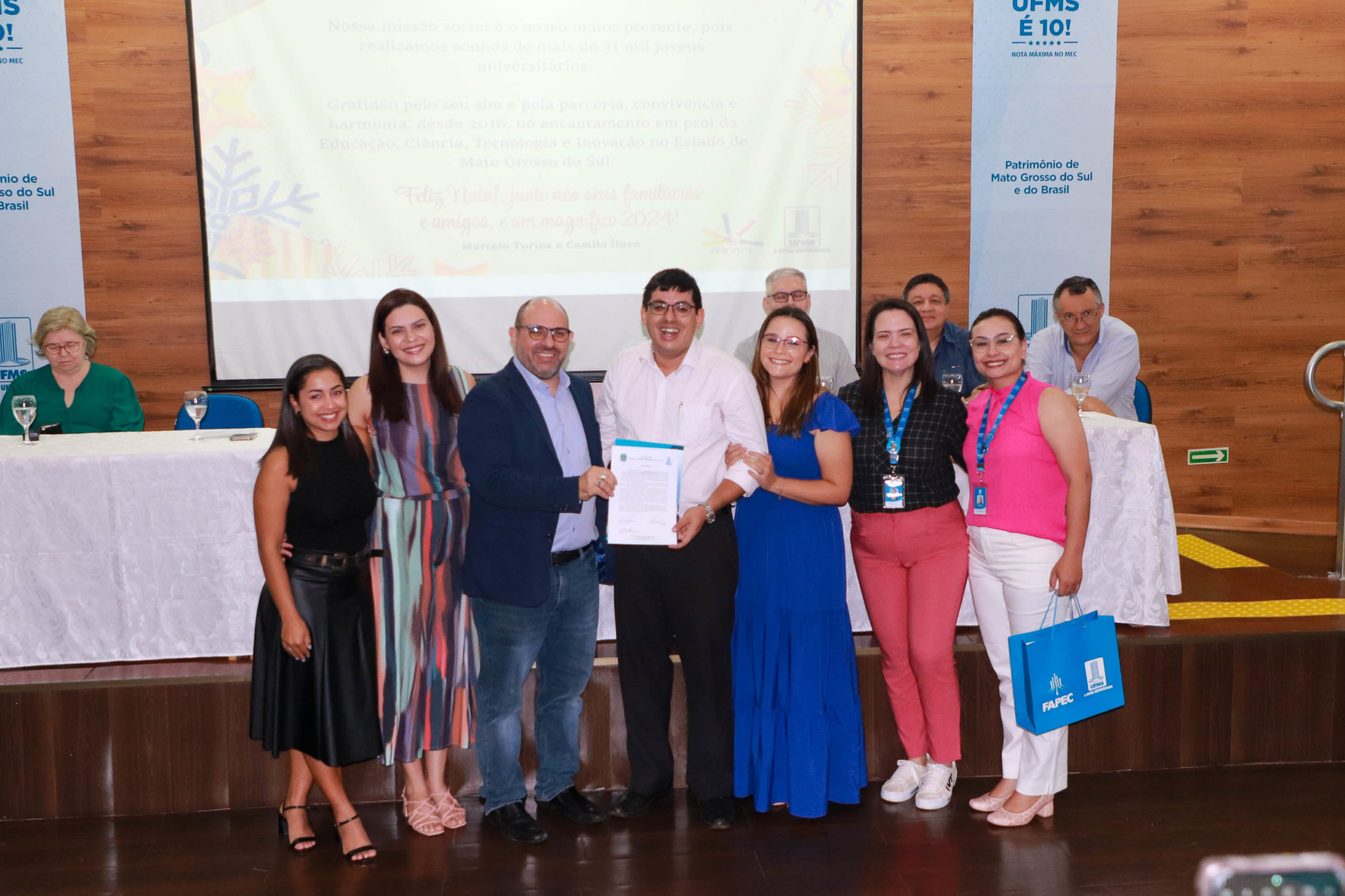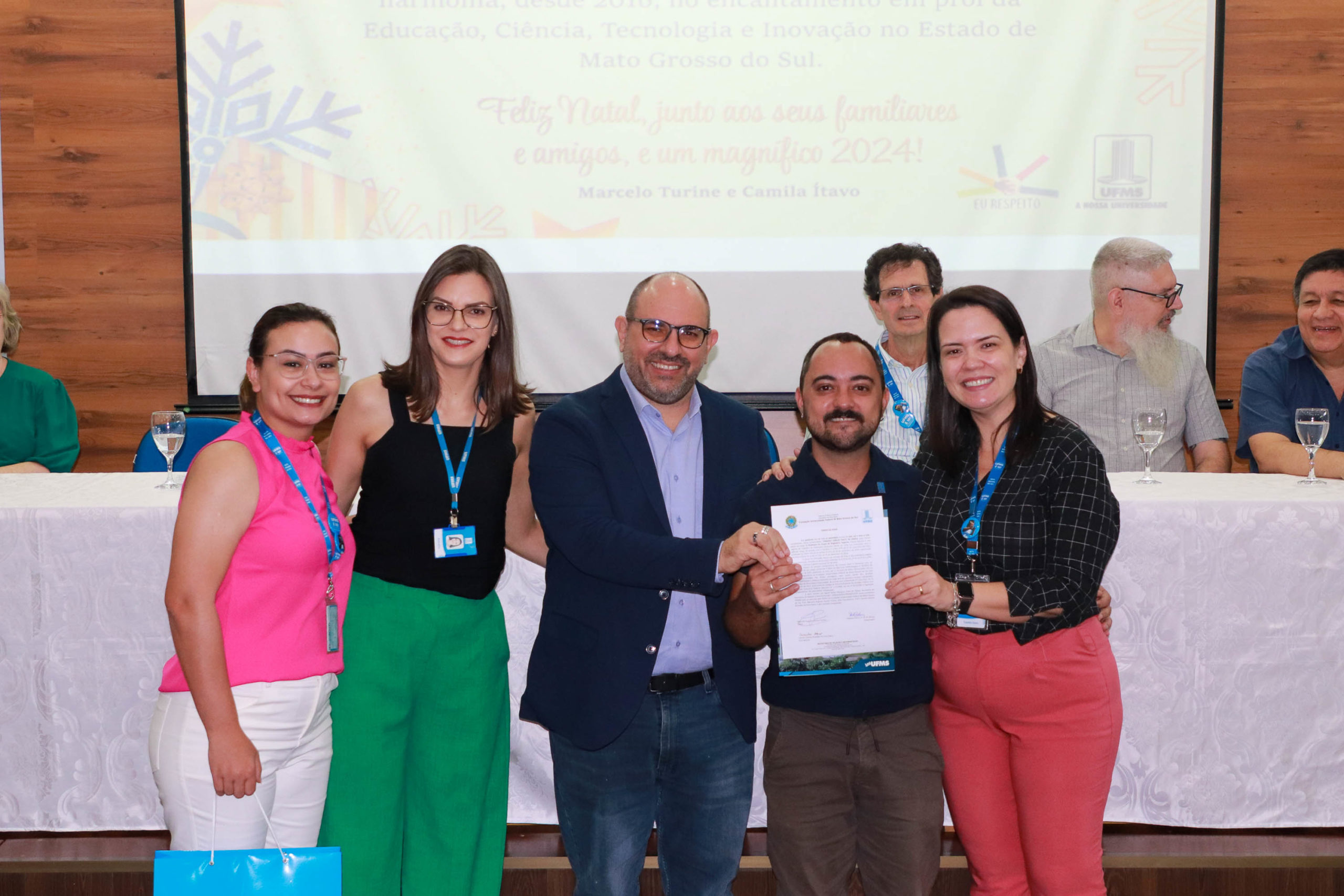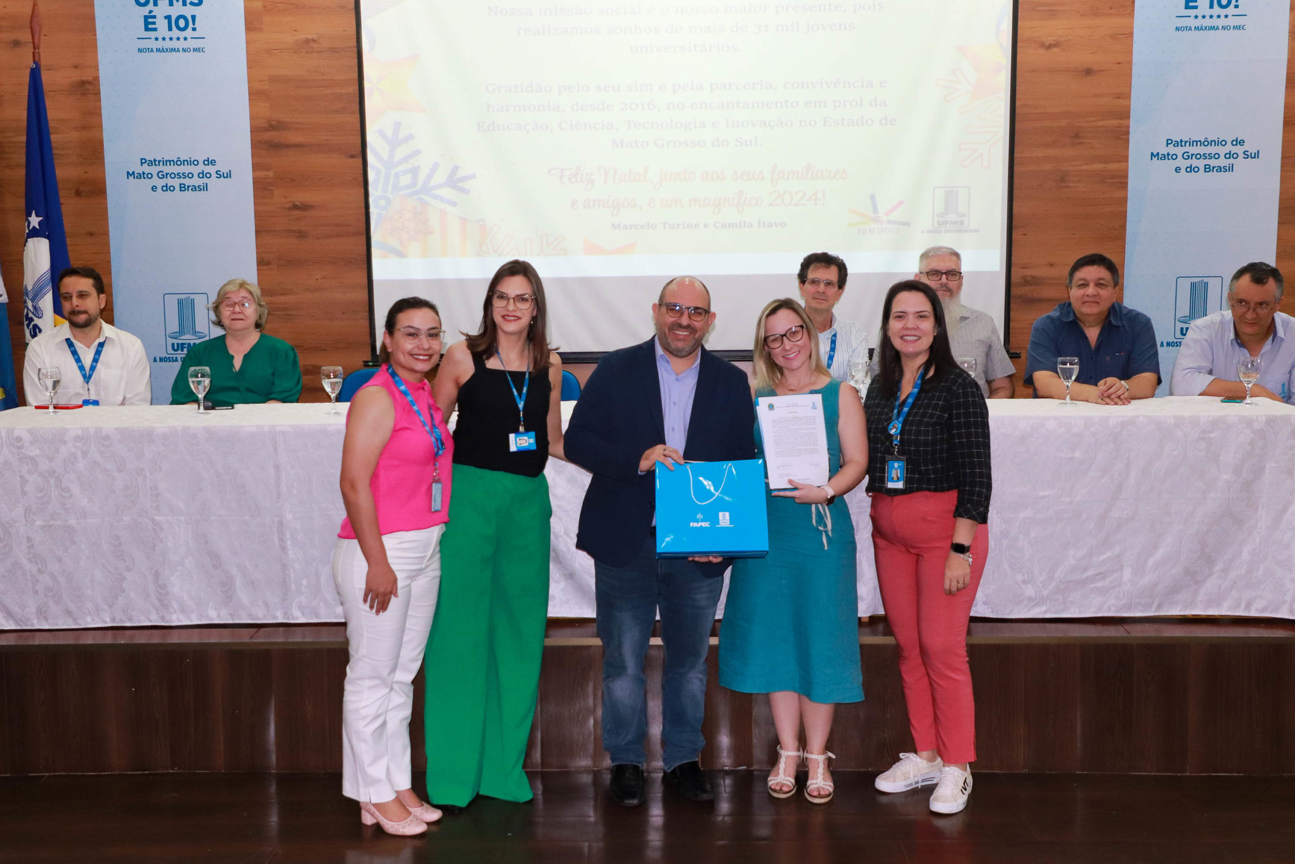 O reitor Marcelo Turine convidou à frente do auditório os diretores presentes e também representantes de diversas unidades, para apresentá-los aos novos colegas. Falou brevemente sobre a infraestrutura da UFMS, sua representatividade no estado e país e ressaltou a importância de cada um que inicia sua jornada na Instituição. “Sejam muito bem-vindos à nossa Universidade, que é um lugar de acolhimento, inclusão, ética e respeito. Somos a maior unidade federal em Mato Grosso do Sul, então temos um papel social e estratégico para o desenvolvimento do estado muito grande. Quando temos o ‘sim’ de vocês para estarem conosco ajudando na Educação, ficamos muito felizes. Tenham diálogo com os nossos jovens, acolham e conheçam suas histórias, isso contribui para a formação de bons cidadãos. O conhecimento é mágico e transforma, queremos sempre entregar bons profissionais para a sociedade. Que em 2024 consigamos fazer muitas entregas juntos”, desejou.