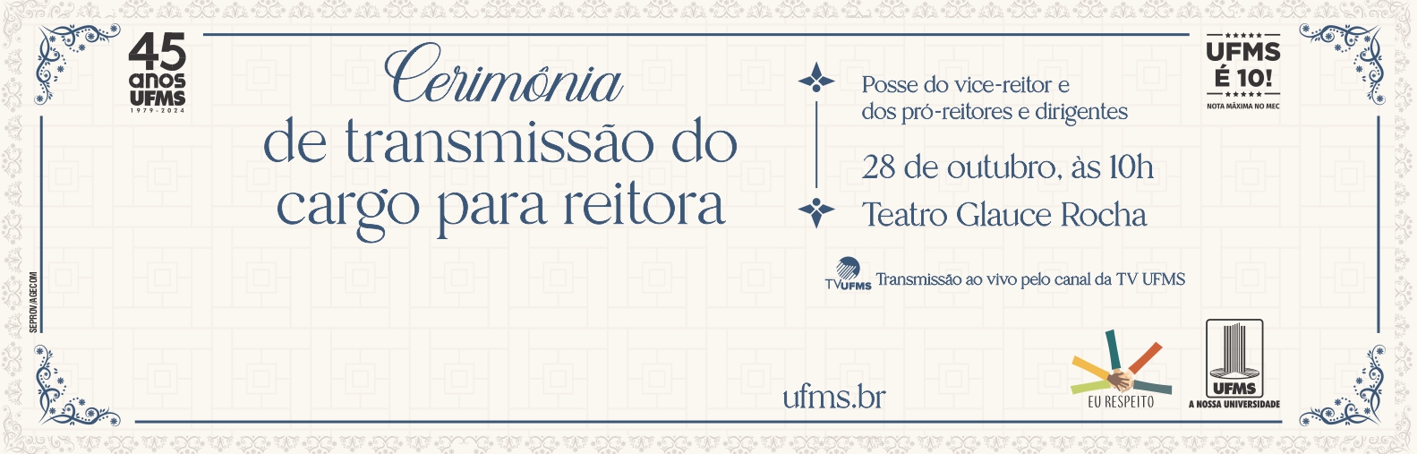 A nova reitora Camila Ítavo receberá o cargo do reitor Marcelo Turine nesta segunda-feira, 28, às 10h, em cerimônia aberta à comunidade no Teatro Glauce Rocha, com transmissão ao vivo para todos os câmpus pelo canal da TV UFMS. O decreto de nomeação da professora para o mandato de quatro anos foi publicado em agosto no Diário Oficial da União, com assinatura do presidente Luiz Inácio Lula da Silva e do ministro da Educação, Camilo de Santana.