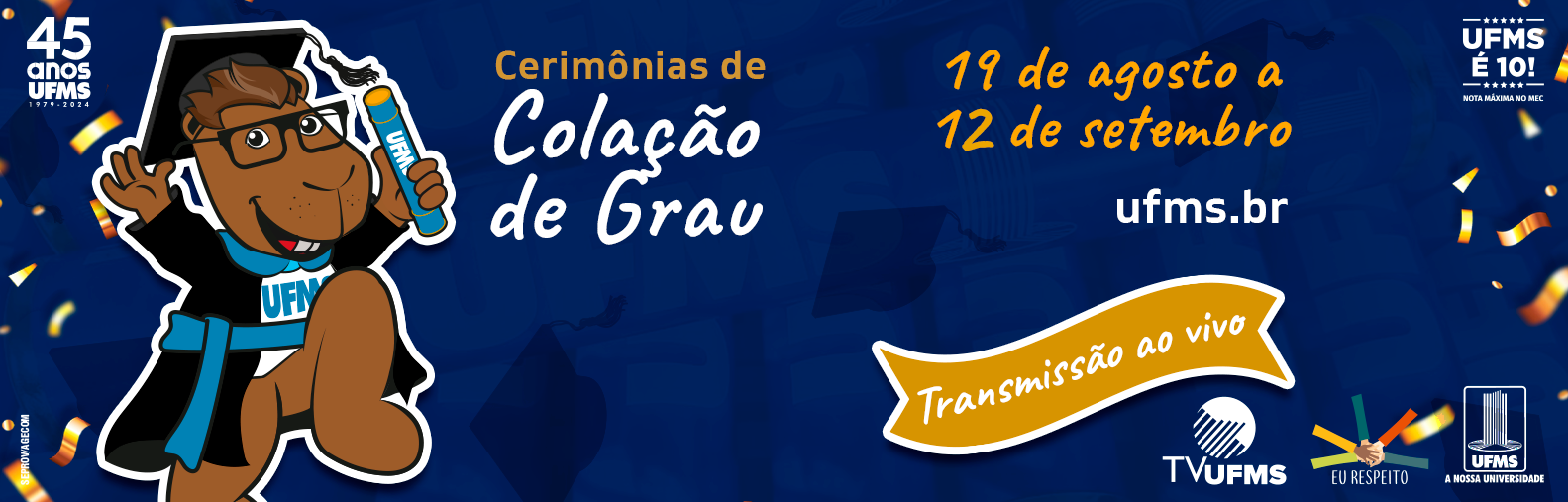 O ciclo de cerimônias de colação de grau do primeiro semestre de 2024 já possui data para iniciar: a partir do dia 19 de agosto, em todos os câmpus, com transmissão ao vivo pela TV UFMS.