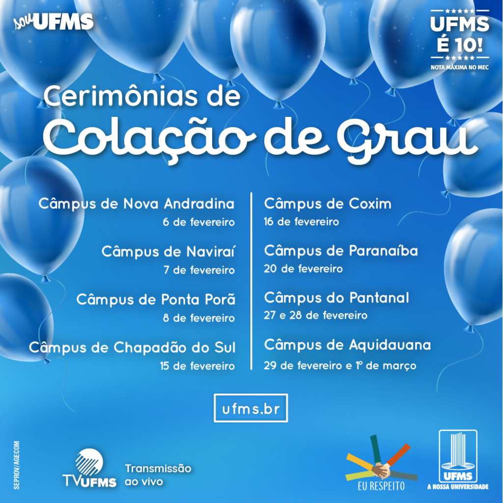 A Universidade retoma na próxima terça-feira, 6, o calendário de cerimônias de colação de grau dos mais de 700 formandos dos Câmpus de Aquidauana (CPaq), de Chapadão do Sul, de Coxim, de Naviraí, de Nova Andradina (CPNA), de Paranaíba, do Pantanal e de Ponta Porã (CPPP). O CPNA abre o cronograma de celebrações e as festividades seguem até o dia 1º de março, com a colação dos estudantes do CPaq. Com exceção da primeira cerimônia, que inicia às 19h, todas as demais serão realizadas a partir das 18h, com transmissão ao vivo pelo canal da TV UFMS, às 18h.