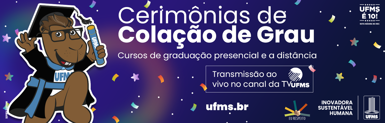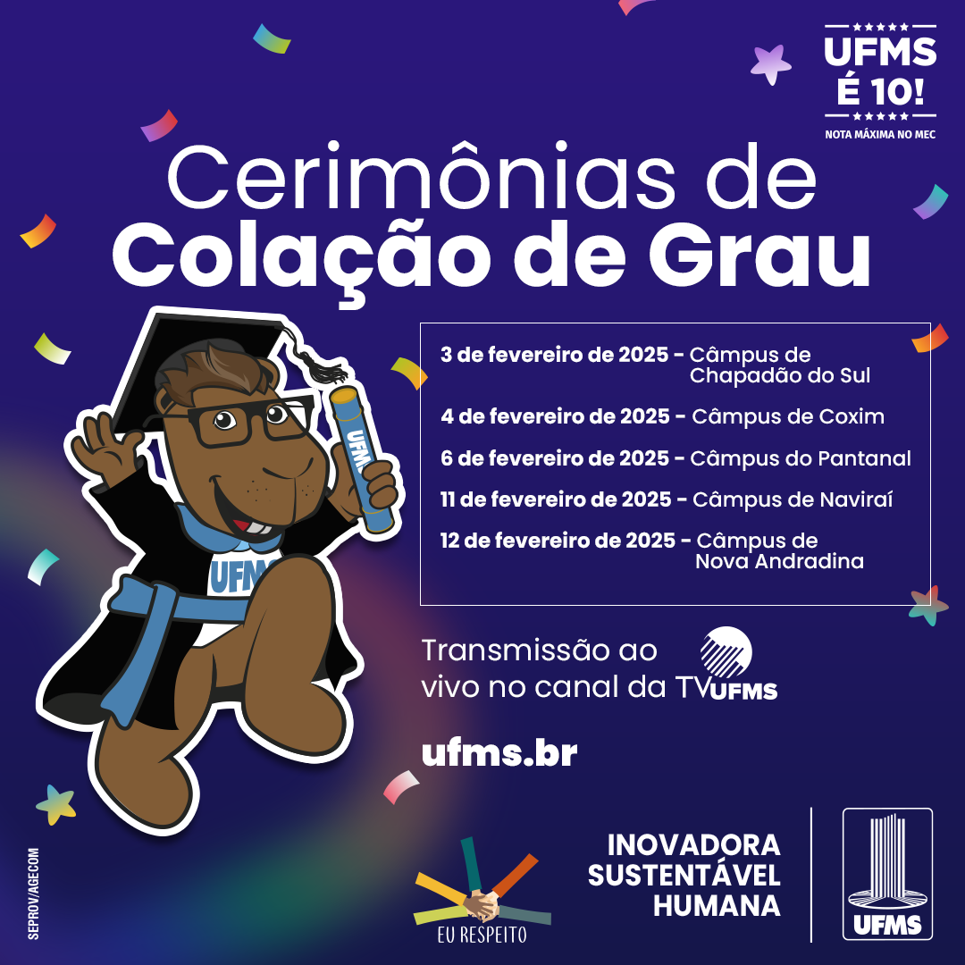 As cerimônias de colação de grau do segundo semestre de 2024 serão retomadas a partir desta segunda-feira, 3, com os formandos dos cursos de graduação presencial e a distância dos Câmpus de Chapadão do Sul (CPCS), de Coxim (CPCX), do Pantanal (CPan), de Naviraí (CPNV) e de Nova Andradina (CPNA). As solenidades serão transmitidas ao vivo pelo canal da TV UFMS.