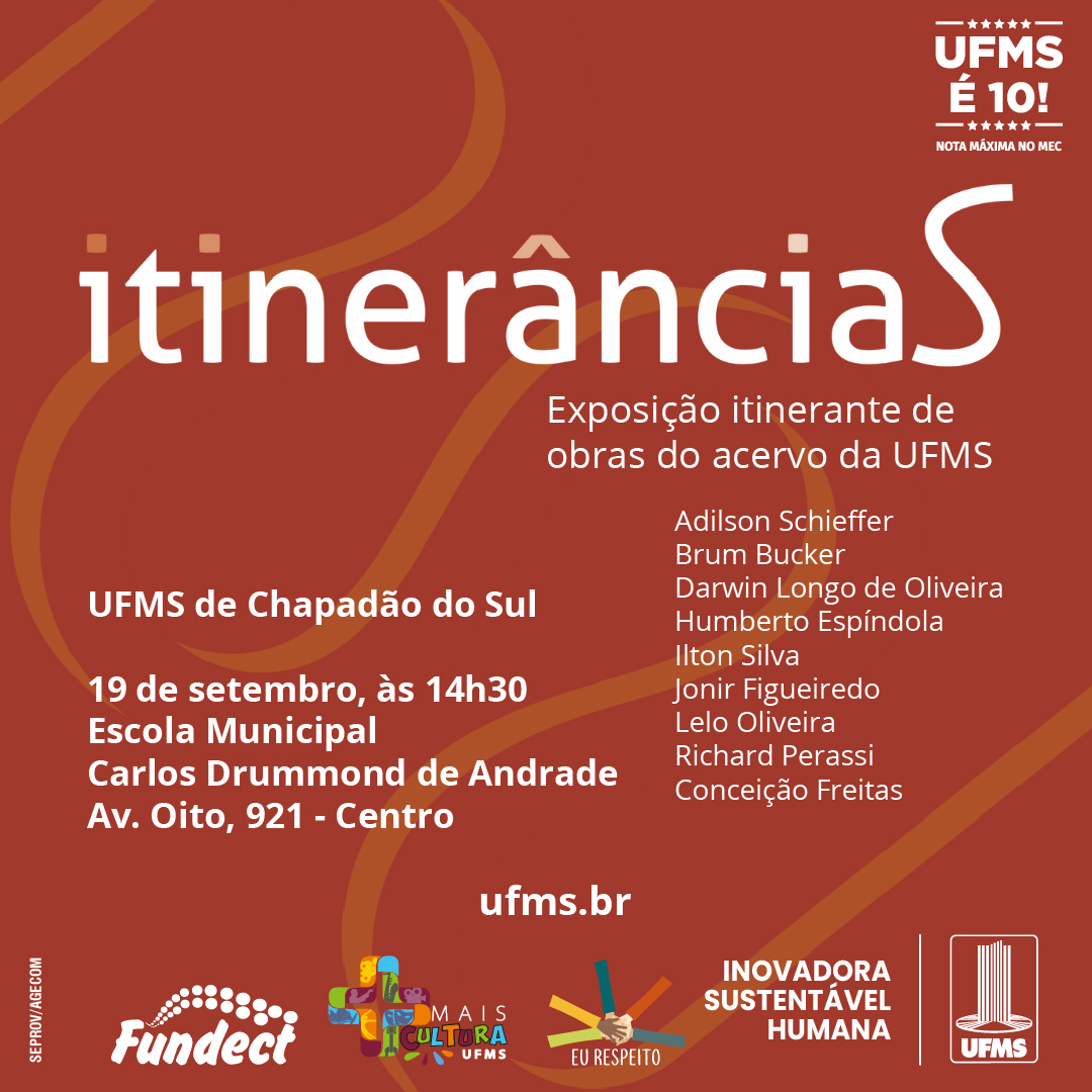 “Convidamos todos os estudantes, servidores e a comunidade em geral a visitarem a exposição Itinerâncias em sua passagem por Chapadão do Sul. Prestigiem a riqueza artística local, refletir sobre as múltiplas narrativas apresentadas nas obras e celebrar conosco os 46 anos da Federal”, finaliza o diretor.