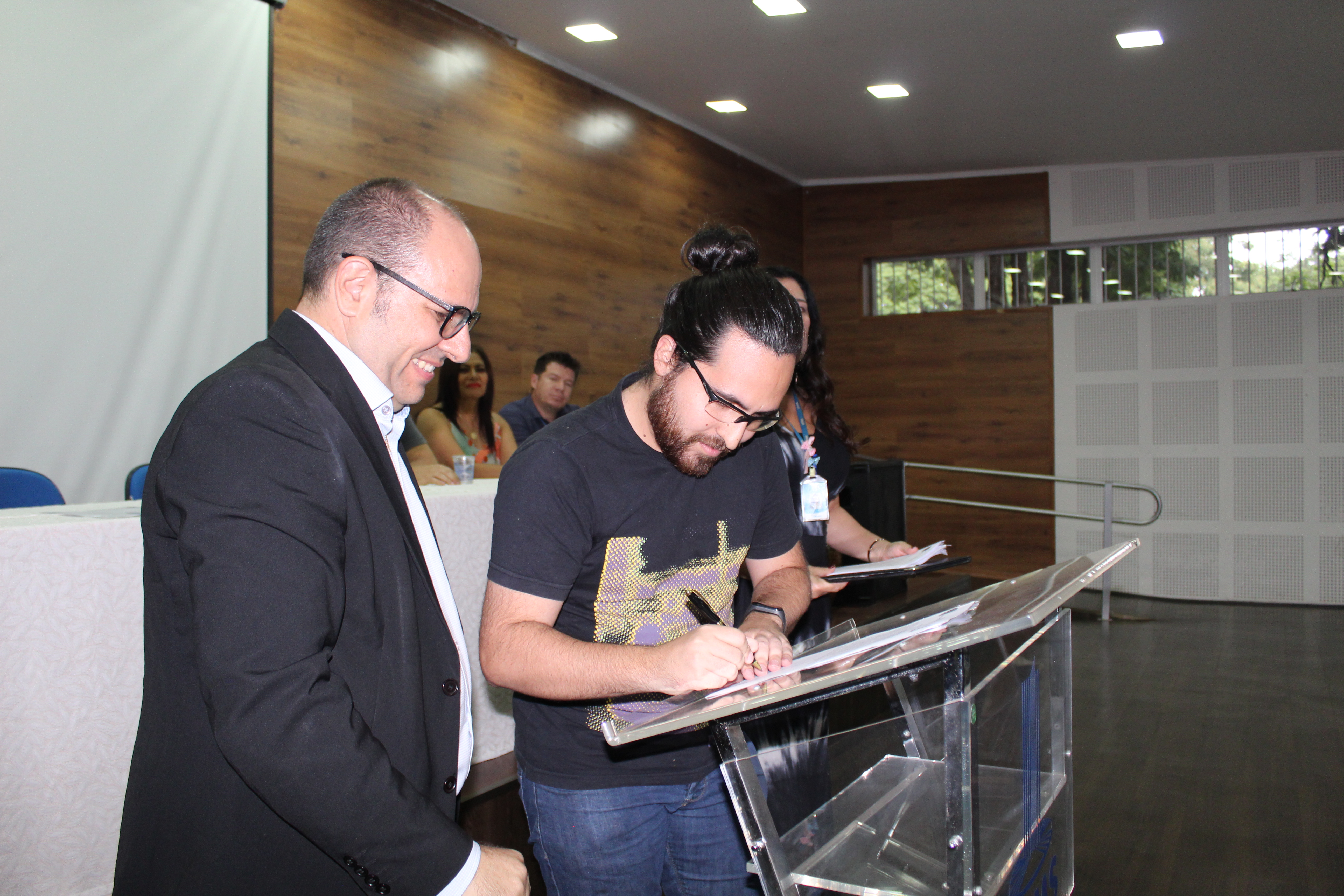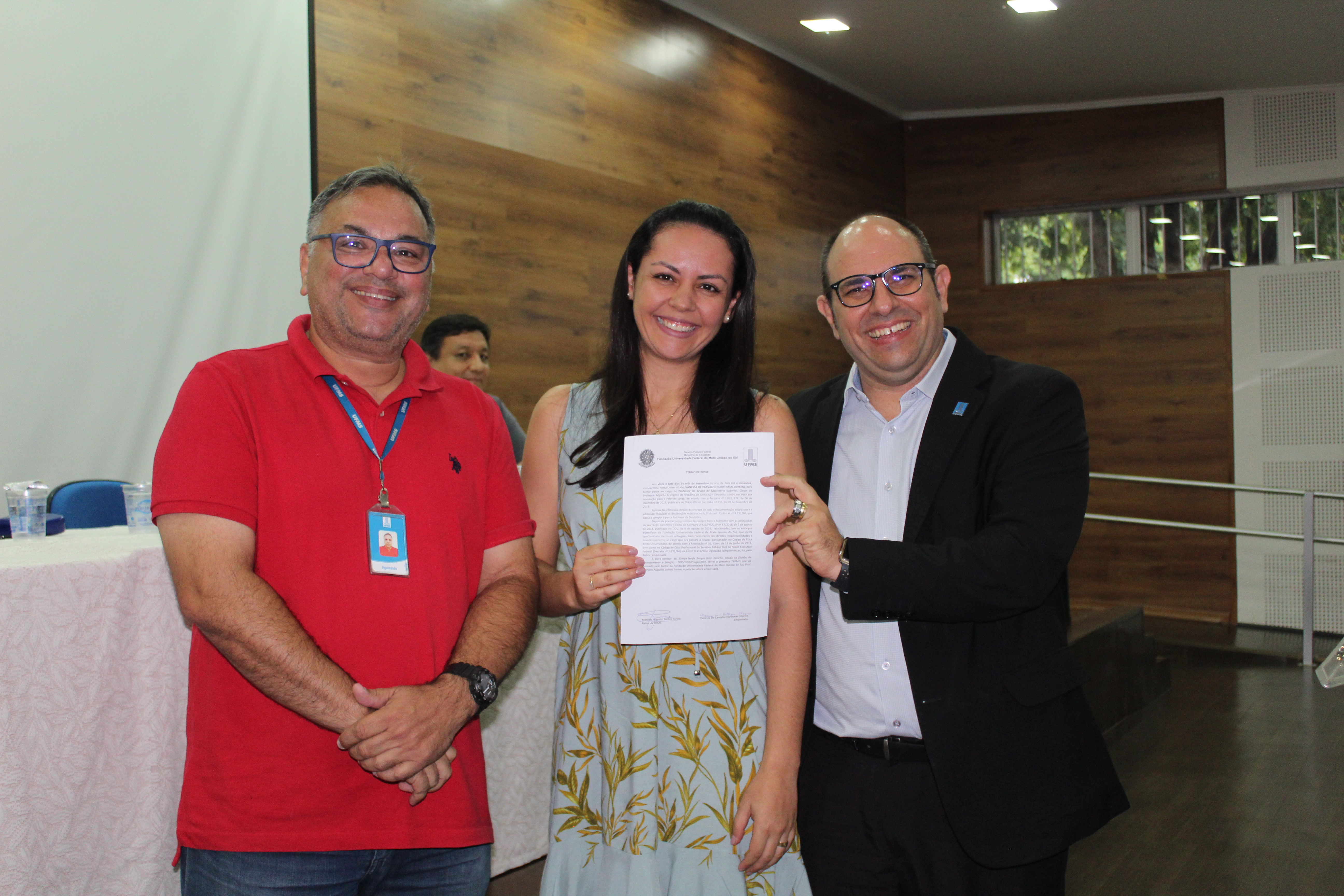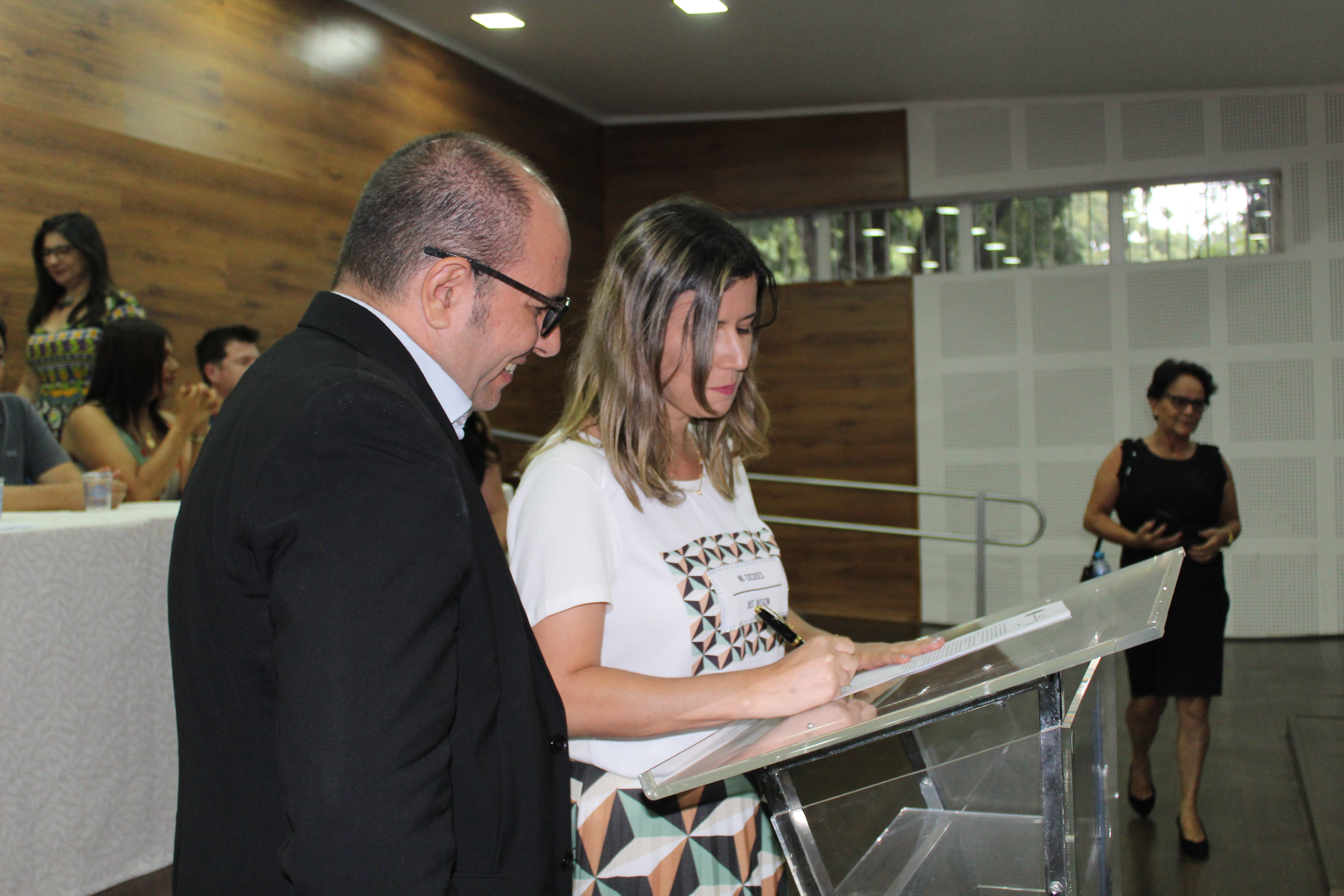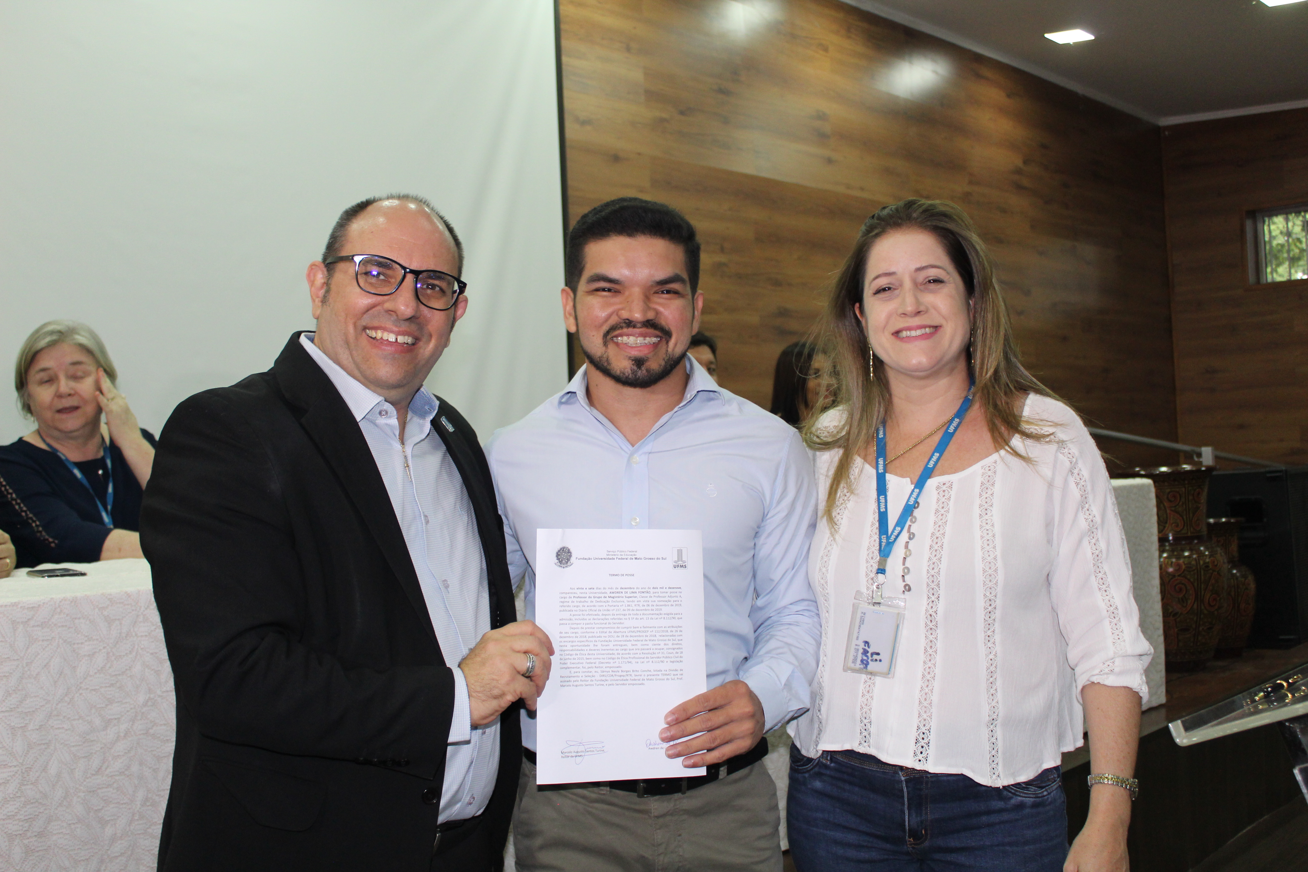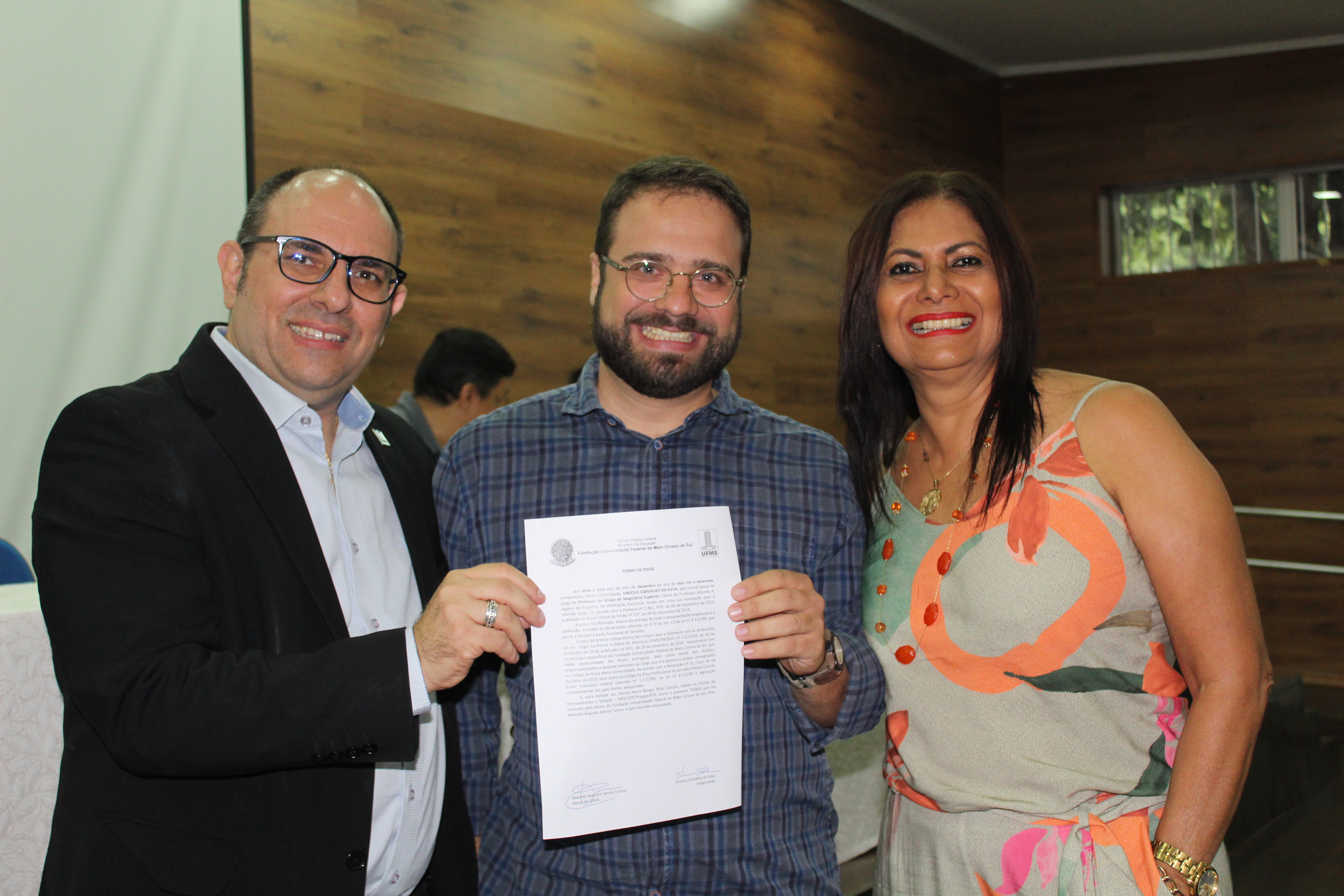 Tomaram posse como técnicos-administrativos Renan Marcel Mugica de Mello, que vai atuar como auxiliar em Administração na Agência de Comunicação Social e Científica e Nataly Luiza Nantes Ojeda, como técnica em Contabilidade na Pró-Reitoria de Planejamento, Orçamento e Finanças (Proplan). “Vocês são fundamentais para manter a Universidade como uma das melhores do mundo e a melhor de Mato Grosso do Sul. Sejam muito bem-vindos”, falou a pró-reitora de Planejamento, Orçamento e Finanças, Dulce Tristão.