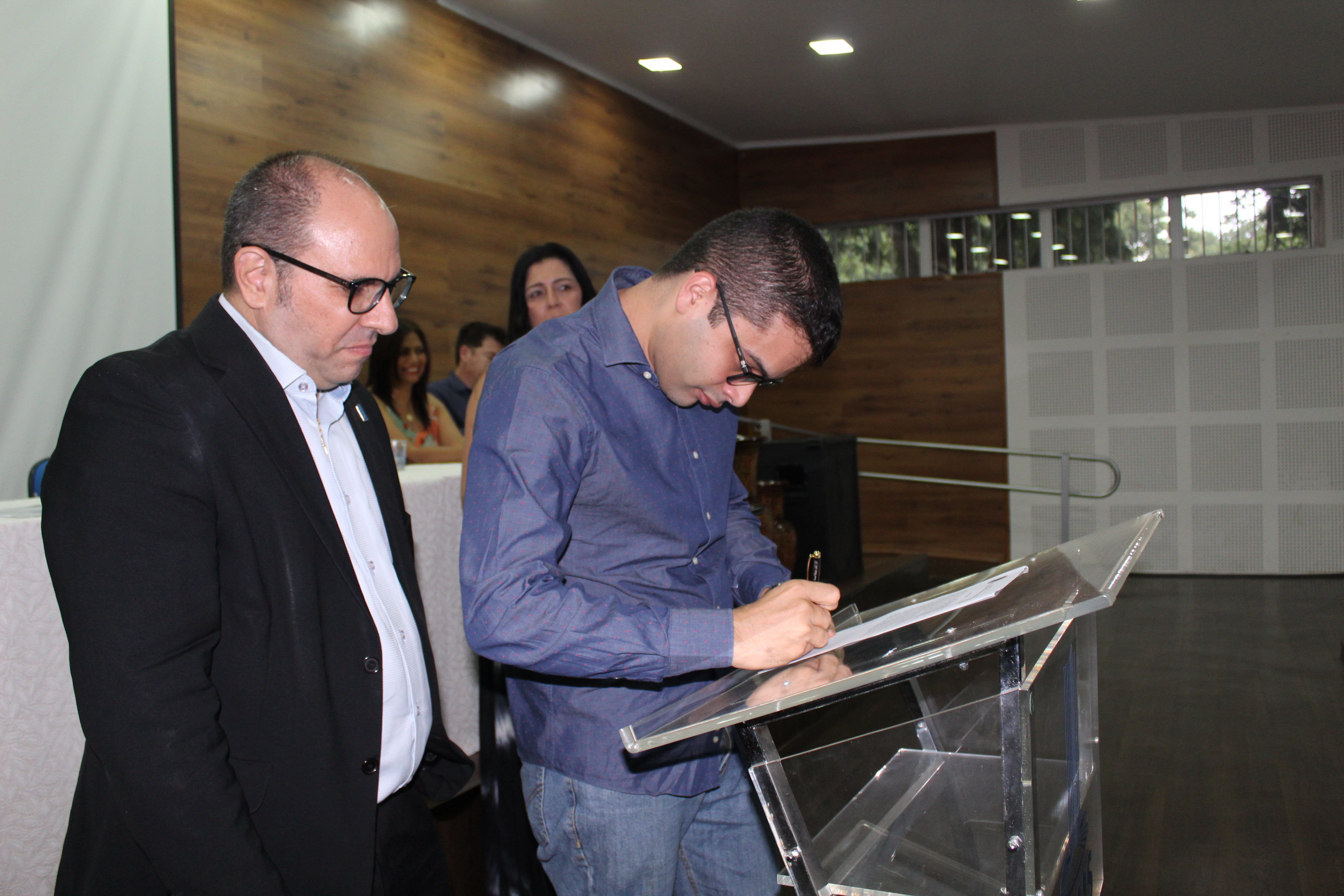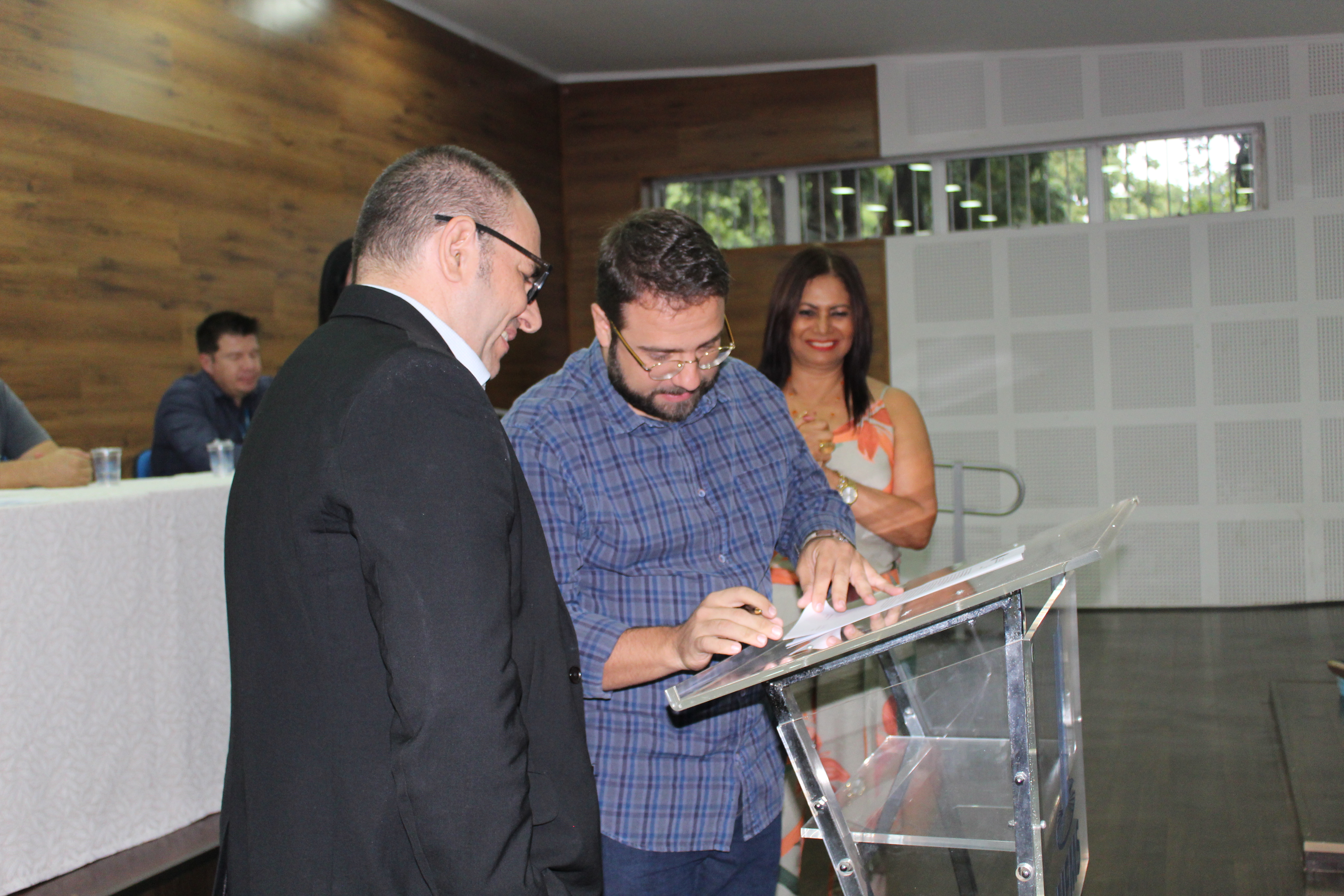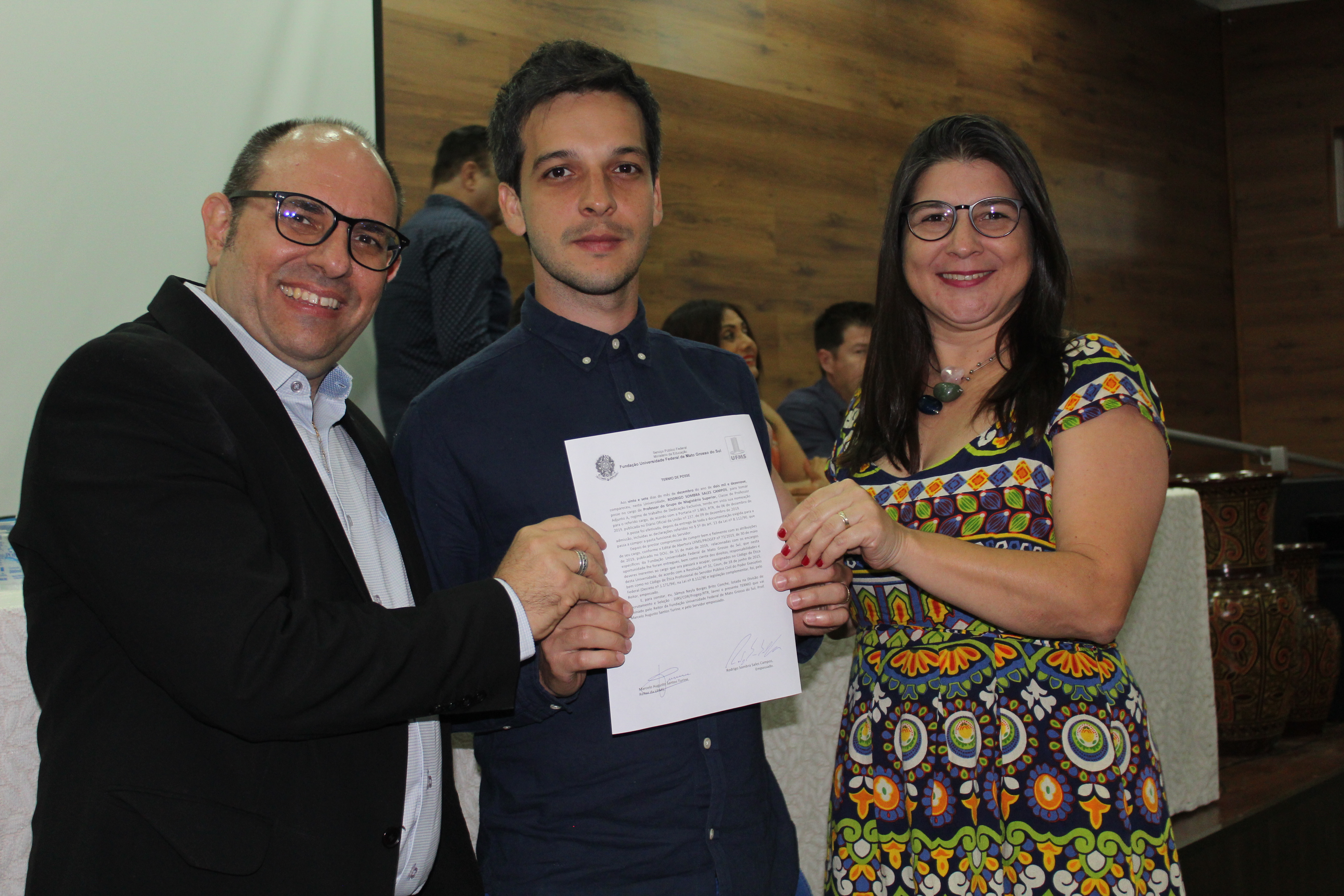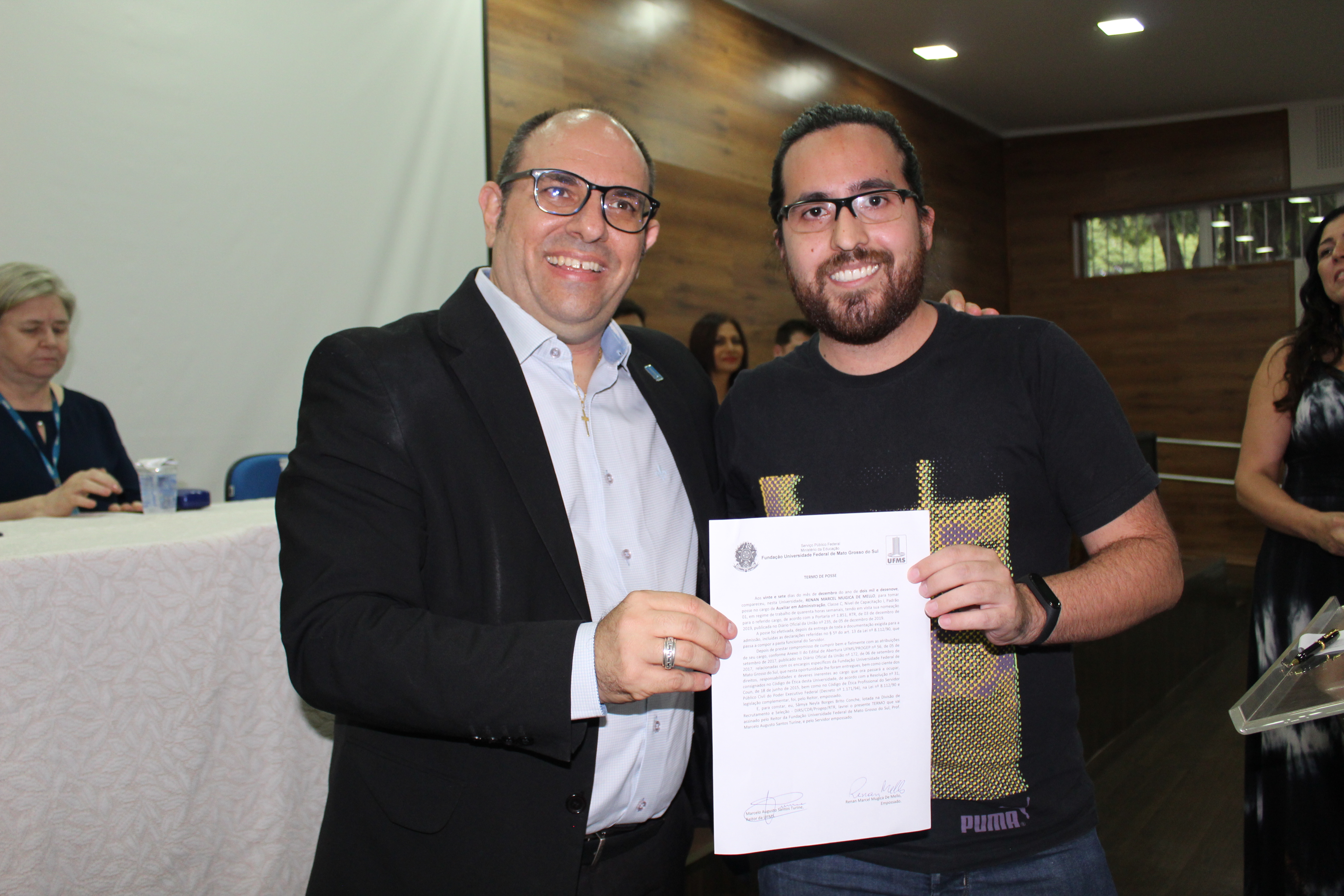 Os professores Pedro Augusto da Costa Franceschini e Vinícius Carvalho da Silva passa a integrar o corpo docente da Faculdade de Ciências Humanas. Vinícius é mestre e doutor em Filosofia da Ciência e Teoria do Conhecimento pela Universidade do Estado do Rio de Janeiro e Pedro é mestre e doutor em Filosofia pela Universidade de São Paulo (USP). “Estamos aqui porque amamos a Universidade, gostamos demais daquilo que fazemos e isso é gratificante. Desejo que vocês fiquem aqui por muito tempo, nosso Estado é lindo, nossa UFMS é linda e aqui vocês podem realizar muito”, disse a diretora da Faculdade Vivina Dias Sol.