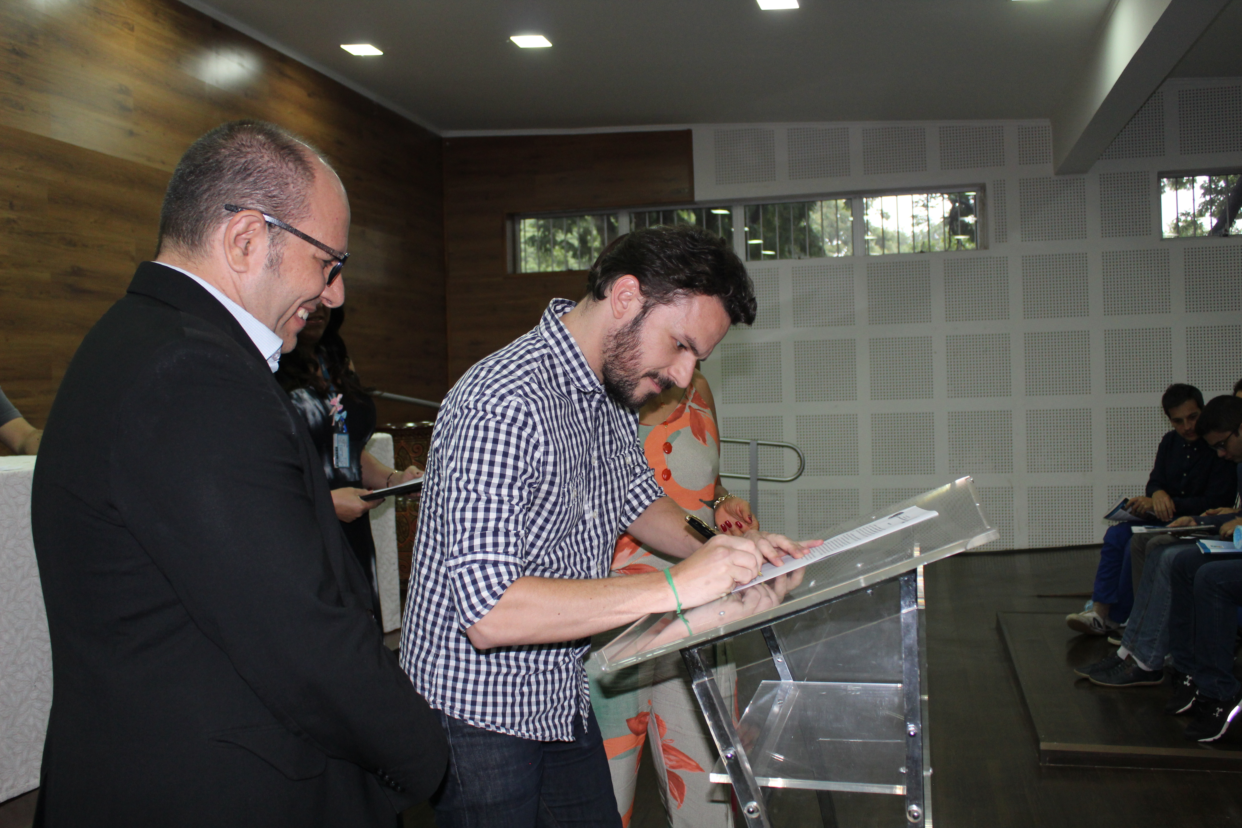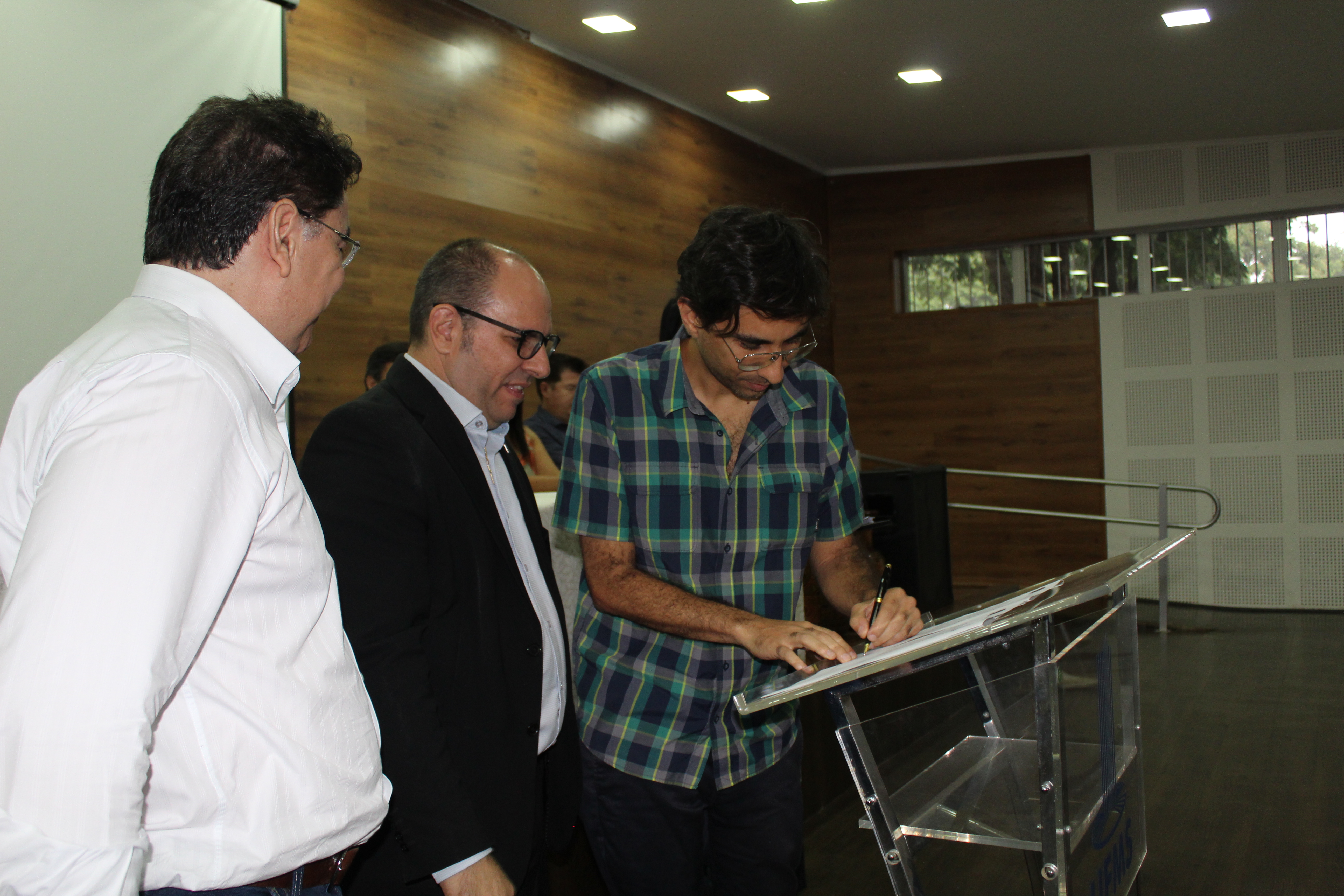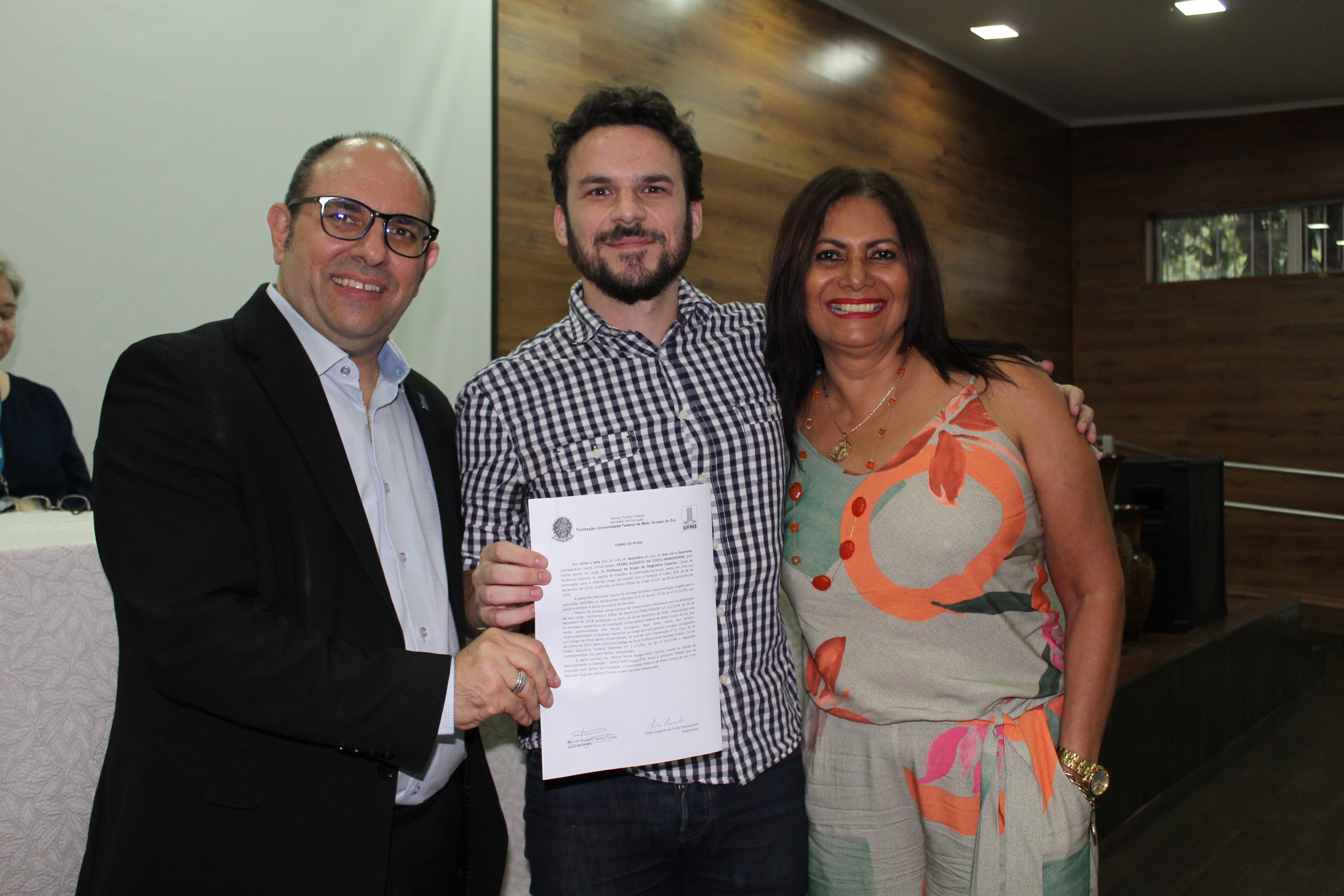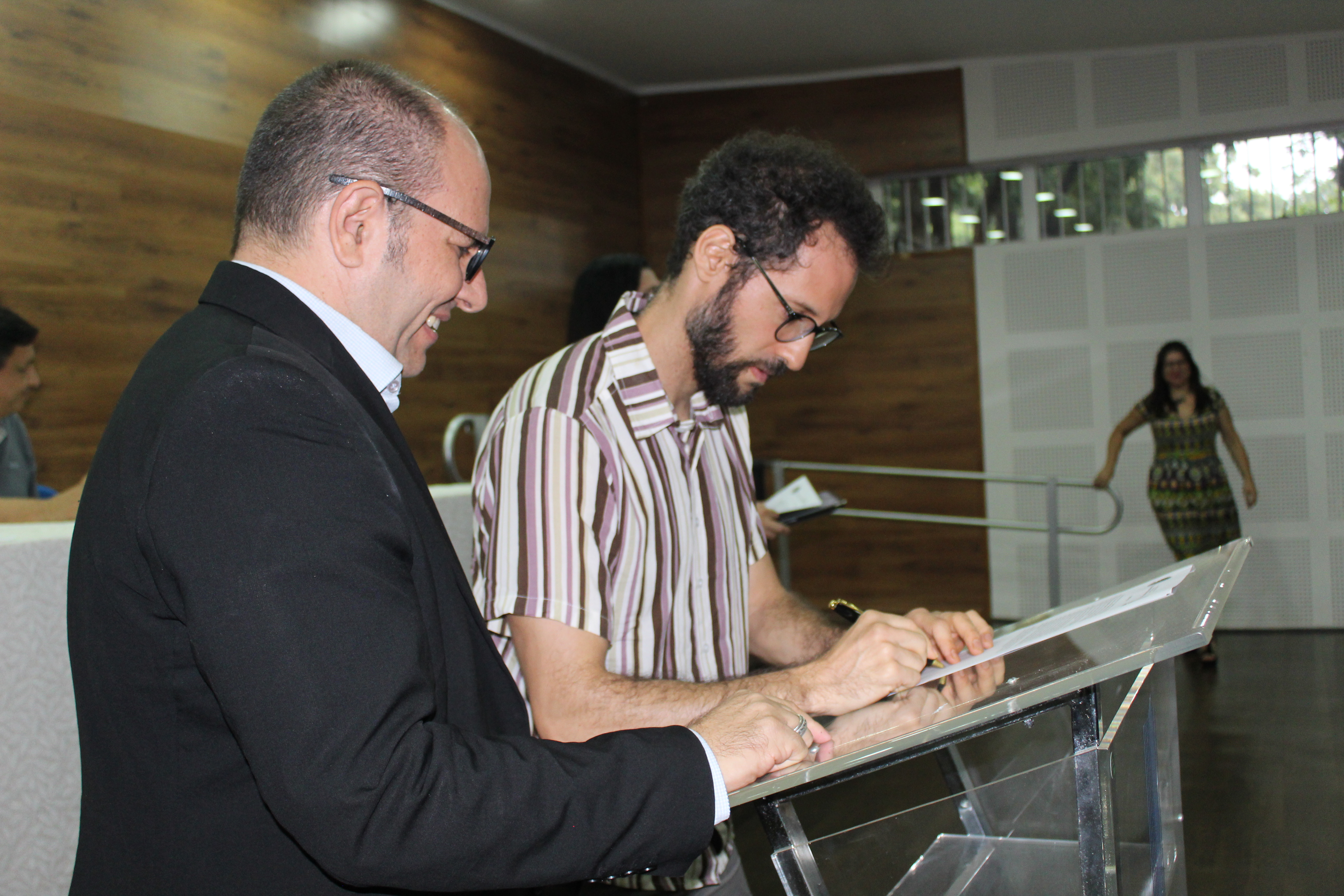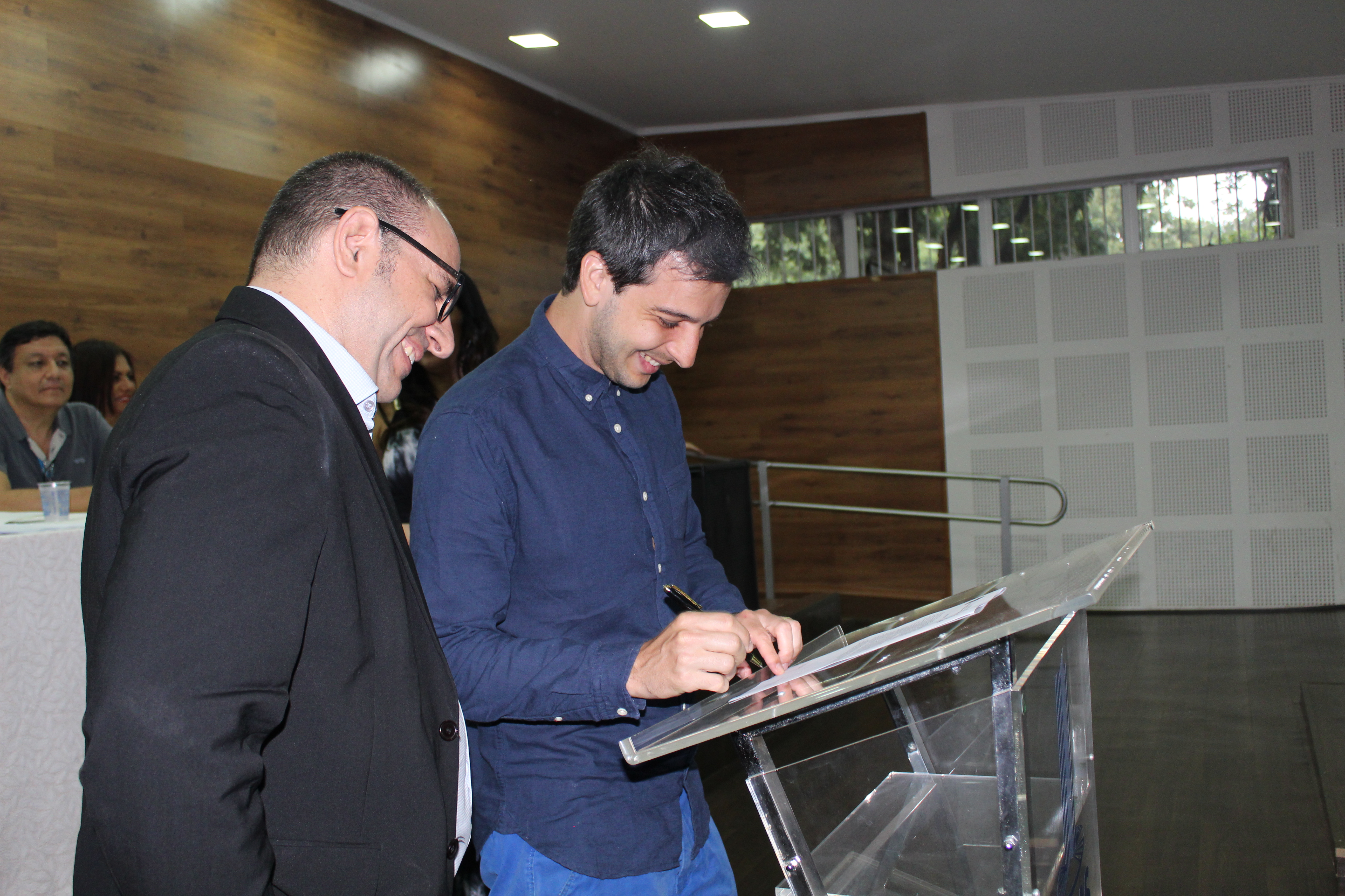 Os professores Pedro Augusto da Costa Franceschini e Vinícius Carvalho da Silva passa a integrar o corpo docente da Faculdade de Ciências Humanas. Vinícius é mestre e doutor em Filosofia da Ciência e Teoria do Conhecimento pela Universidade do Estado do Rio de Janeiro e Pedro é mestre e doutor em Filosofia pela Universidade de São Paulo (USP). “Estamos aqui porque amamos a Universidade, gostamos demais daquilo que fazemos e isso é gratificante. Desejo que vocês fiquem aqui por muito tempo, nosso Estado é lindo, nossa UFMS é linda e aqui vocês podem realizar muito”, disse a diretora da Faculdade Vivina Dias Sol.