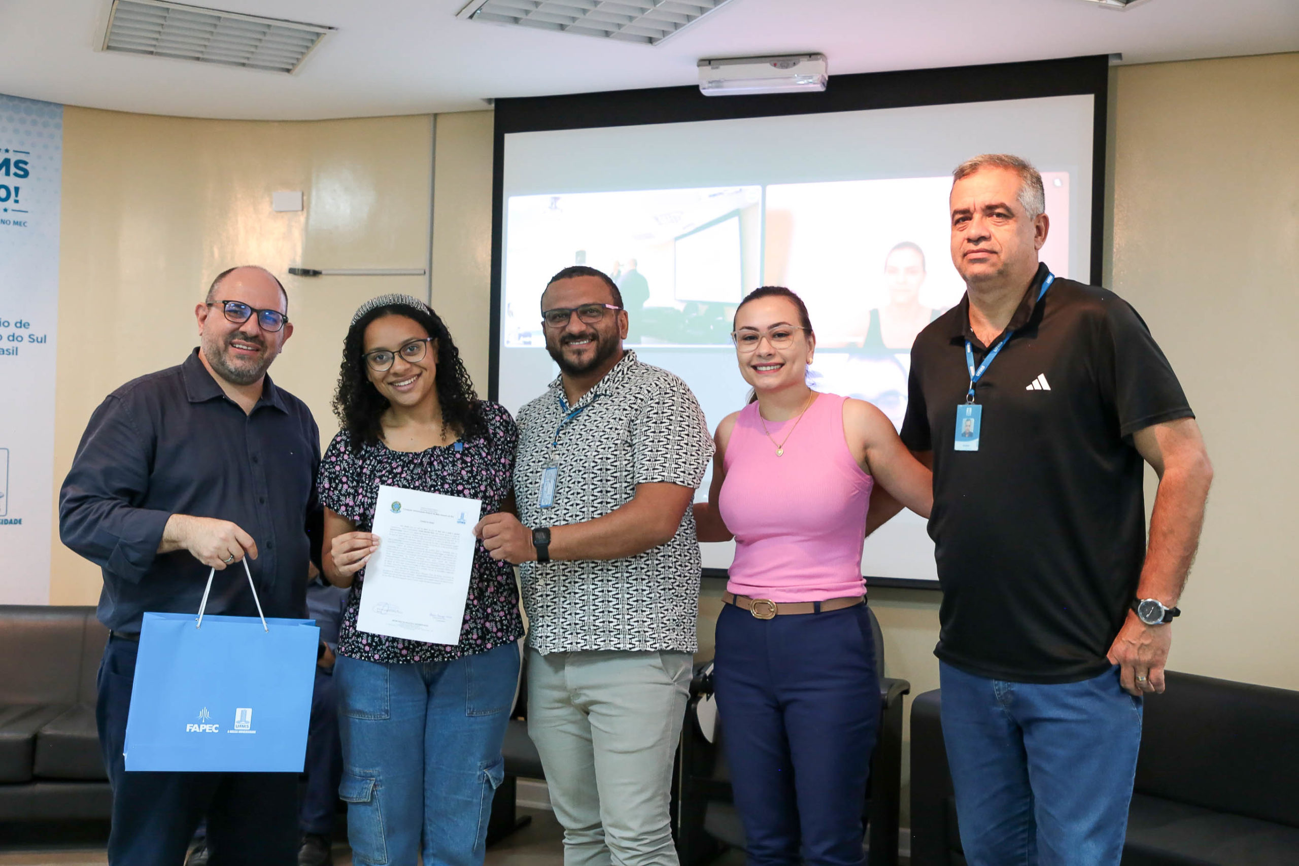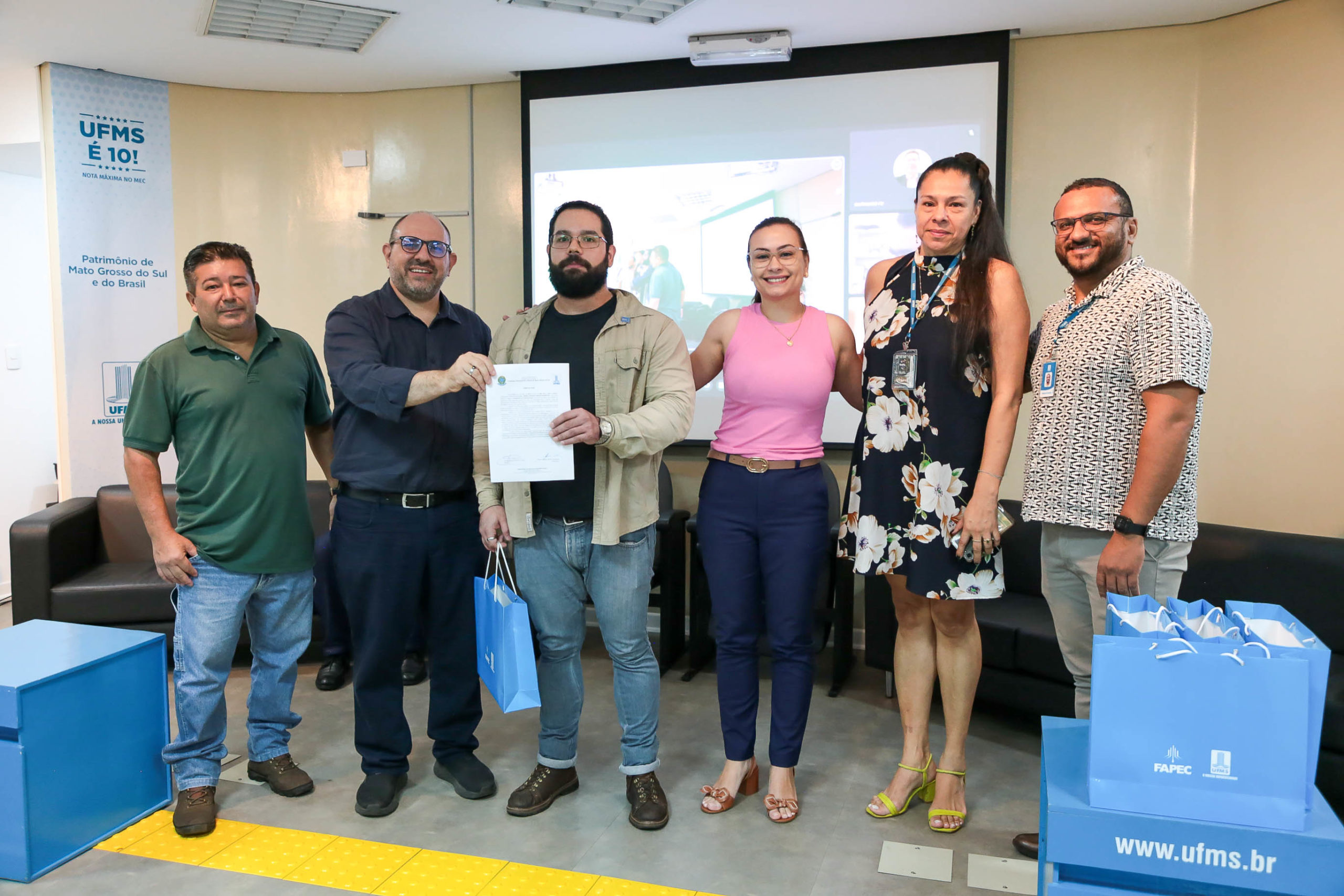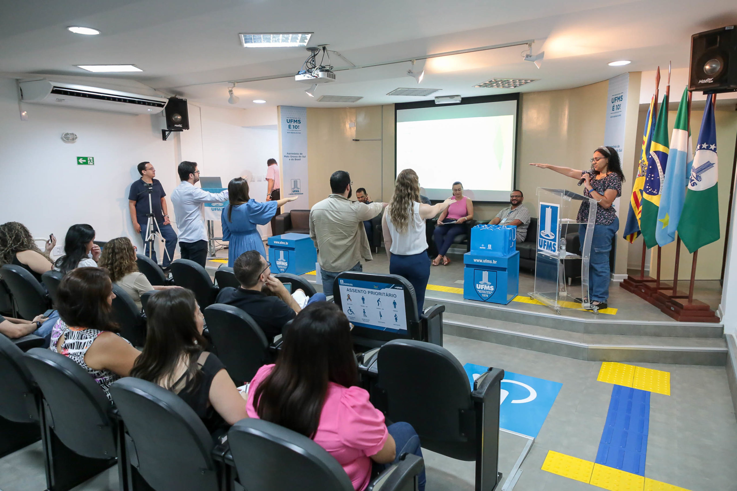 A cerimônia de posse de cinco servidores ocorreu nesta terça-feira, 30, na Cidade Universitária. Entre os empossados, dois atuarão na Pró-Reitoria de Administração e Infraestrutura (Proadi), enquanto os demais serão lotados na Faculdade de Medicina (Famed) e nos Câmpus do Pantanal (CPan) e de Três Lagoas (CPTL). A solenidade foi acompanhada por familiares e outros servidores da Cidade Universitária.