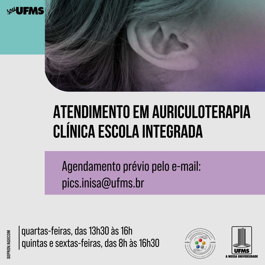 A partir de 1º de junho, membros de toda a comunidade poderão receber atendimento gratuito em auriculoterapia na Clínica Escola Integrada da UFMS. Os horários serão às quartas-feiras, entre 13h30 e 16h, e às quintas e sextas-feiras entre 8h e 16h30, com intervalo entre 10h30 e 13h30. Interessados devem fazer o agendamento prévio pelo e-mail pics.inisa@ufms.br.