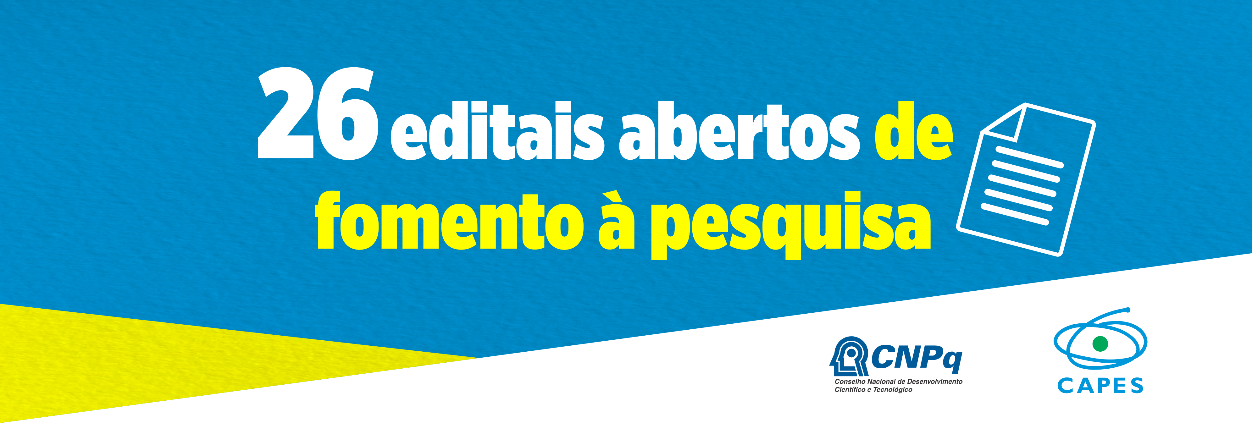 A Pró-Reitoria de Pesquisa e Pós-Graduação (Propp) informa que existem 26 editais do Conselho Nacional de Desenvolvimento Científico e Tecnológico (CNPq) e da Coordenação de Aperfeiçoamento de Pessoal de Nível Superior (Capes) abertos para fomento de pesquisas.