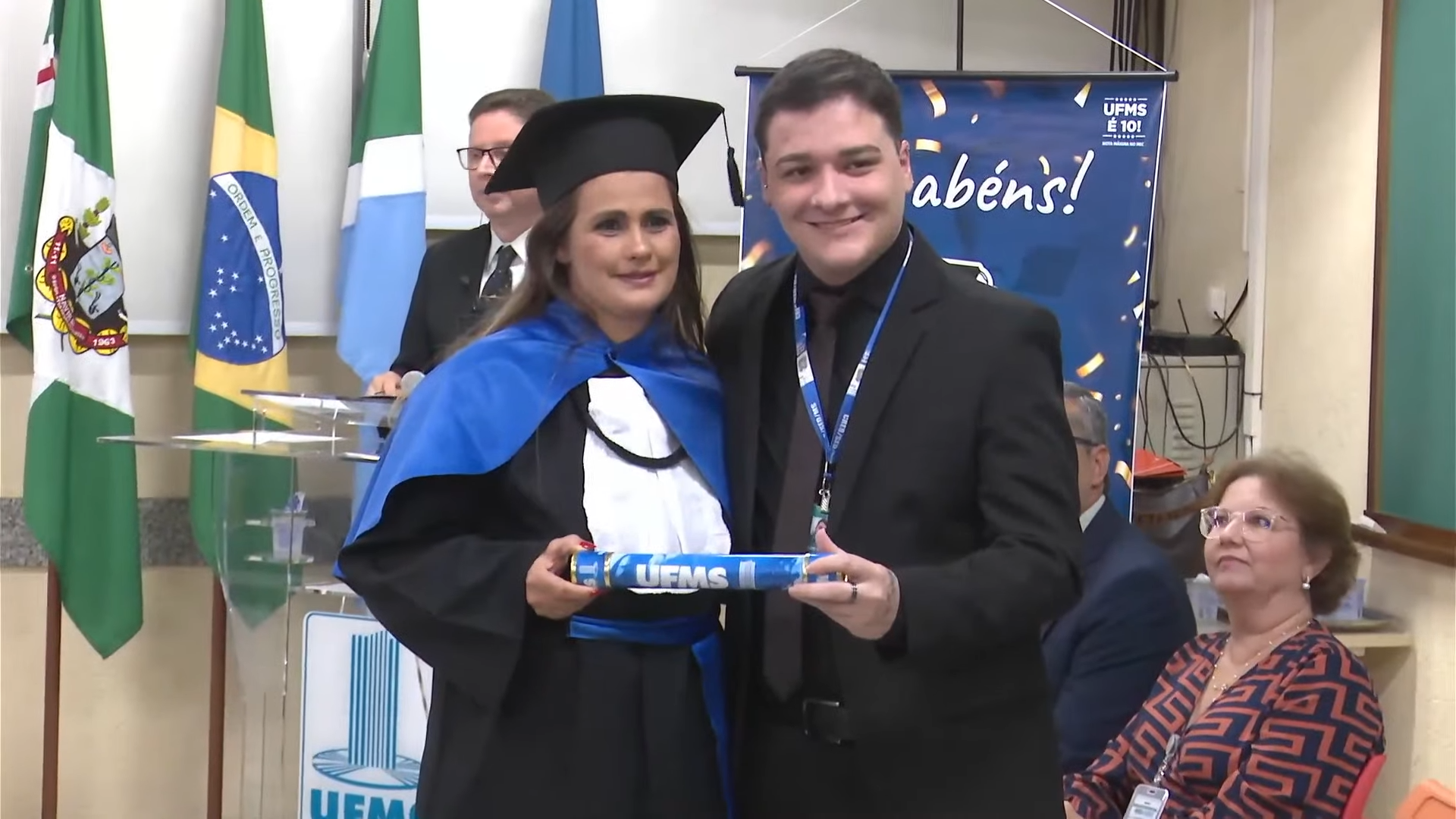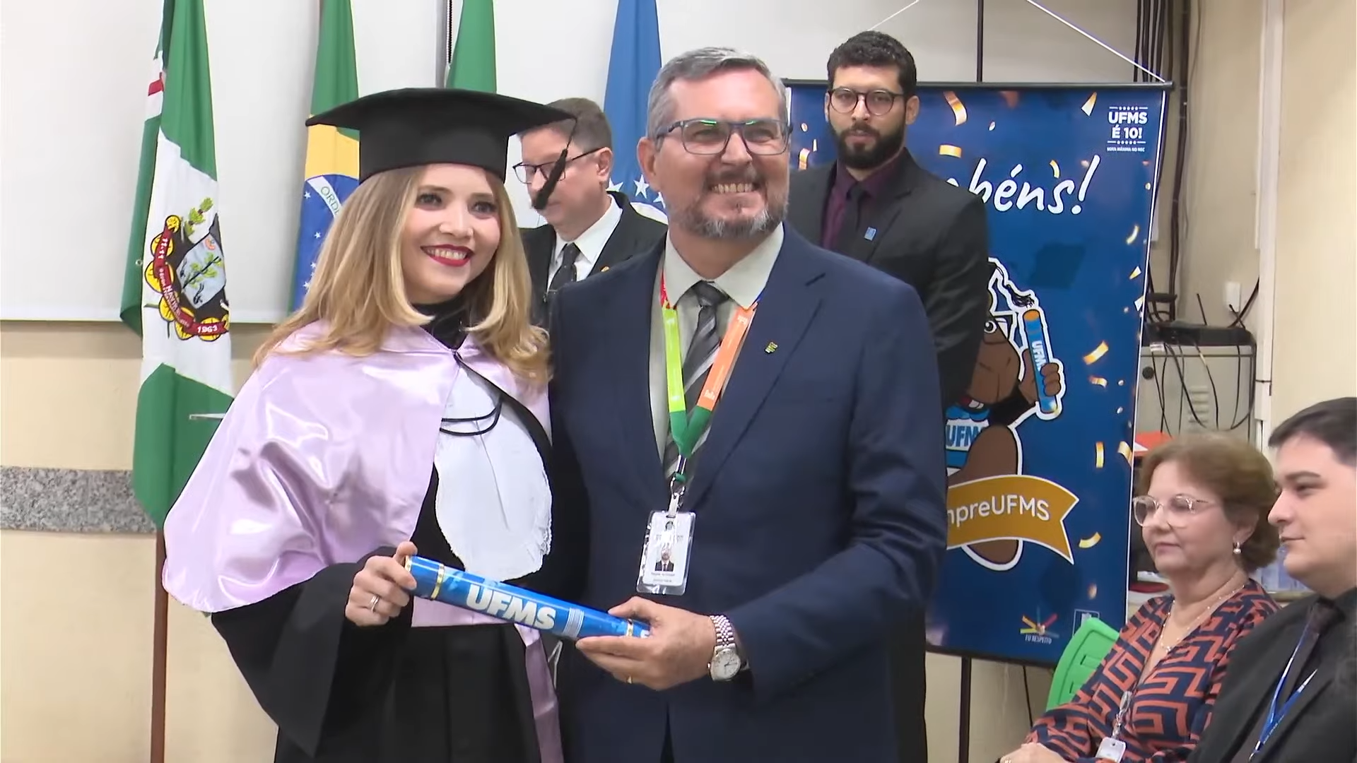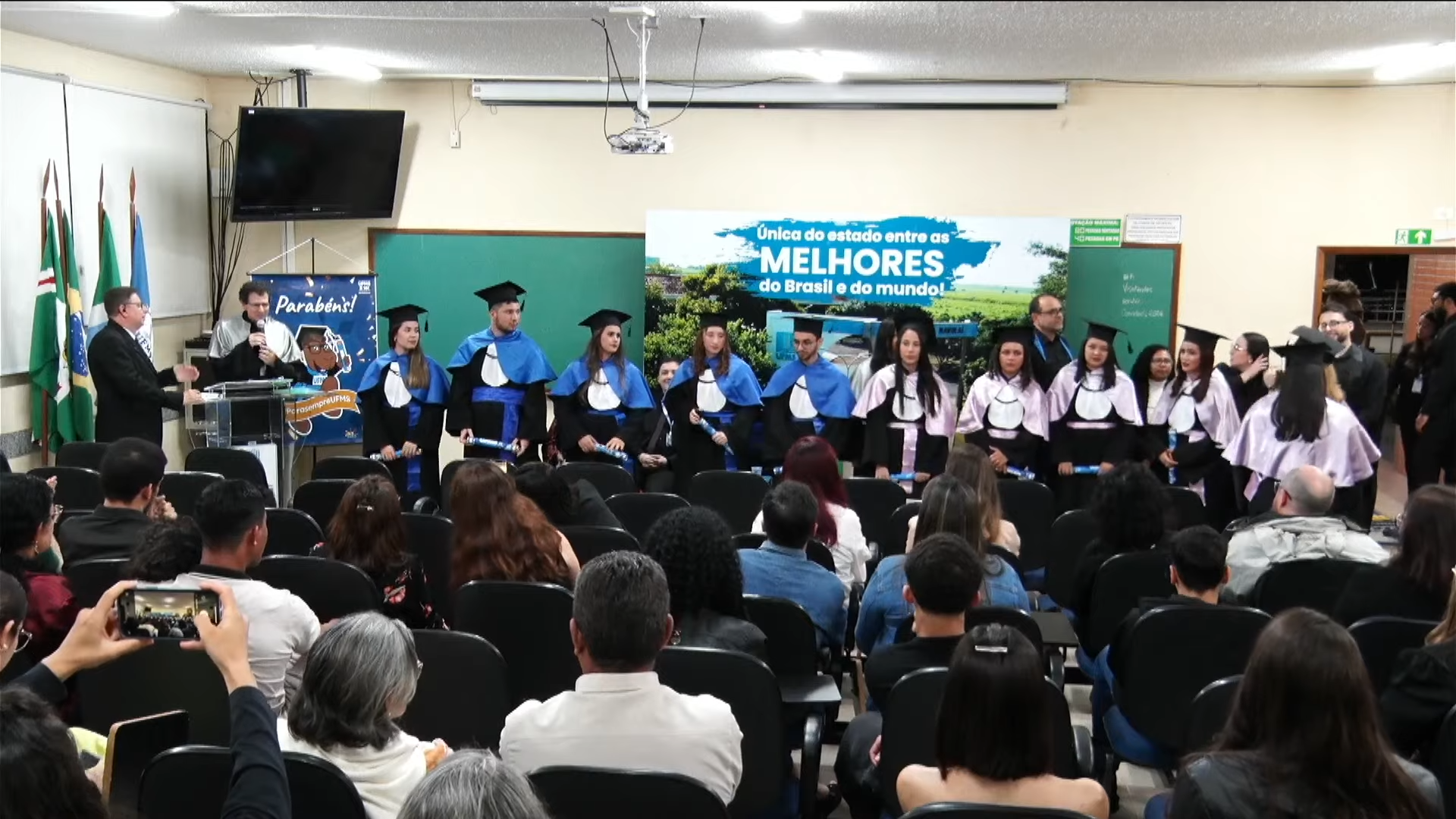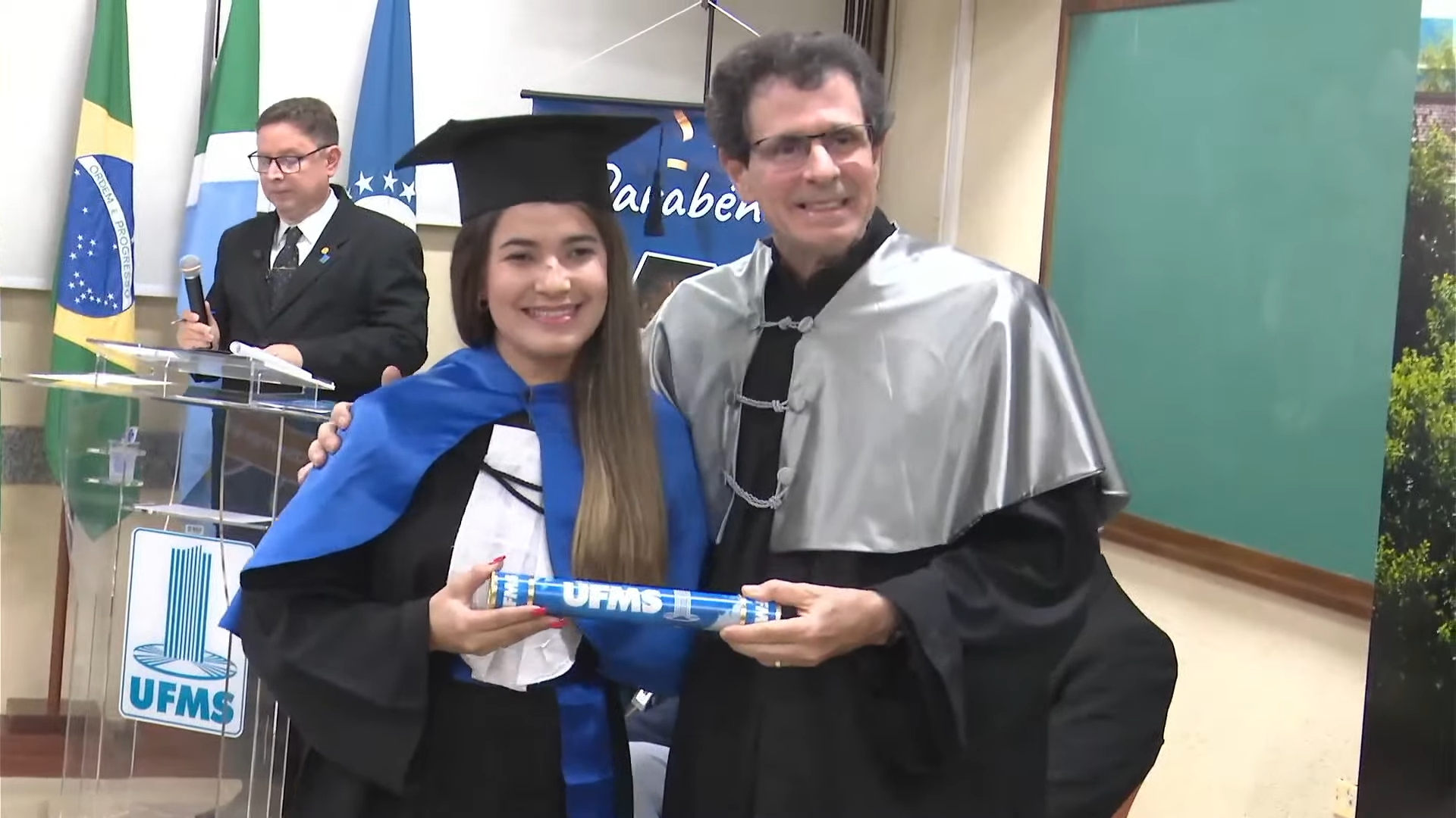 O vice-reitor Albert Schiaveto presidiu a solenidade de colação de grau e, em seu discurso, explicou que a cerimônia oficial e festiva é repleta de simbolismo e tradição. “O importante é que vocês continuem crescendo, desenvolvendo e socializando o conhecimento em benefício da sociedade. A gente não quer formar só profissionais, a gente quer formar líderes, cidadãos conscientes. Vocês estão agora saindo da UFMS para uma nova jornada, e o desafio é de que vocês, que já são líderes, profissionais e cidadãos conscientes, sejam comprometidos com o crescimento sustentável do país e do mundo. Vocês acabam de chegar de uma jornada. O futuro e as realizações são o novo destino”, destacou.