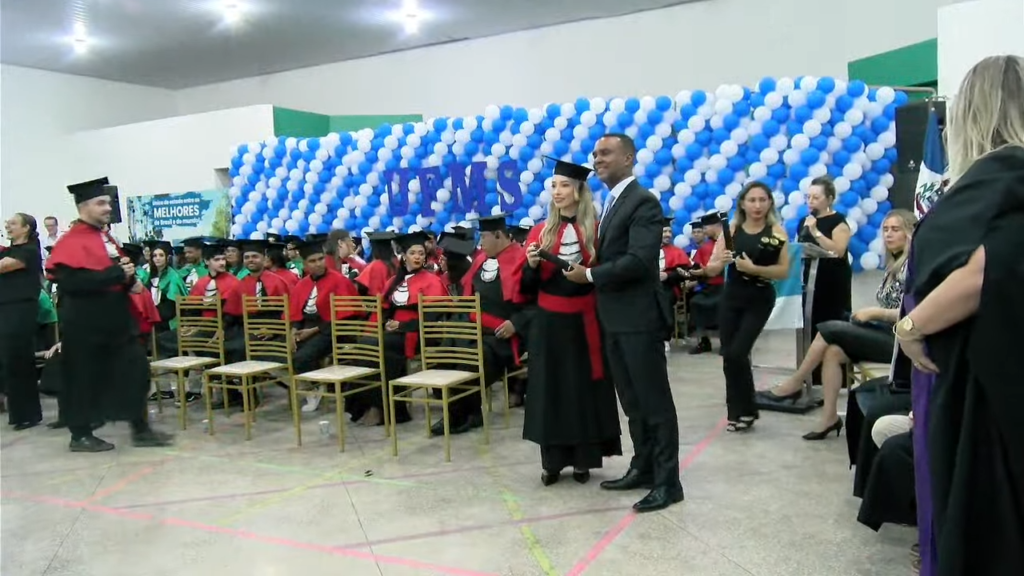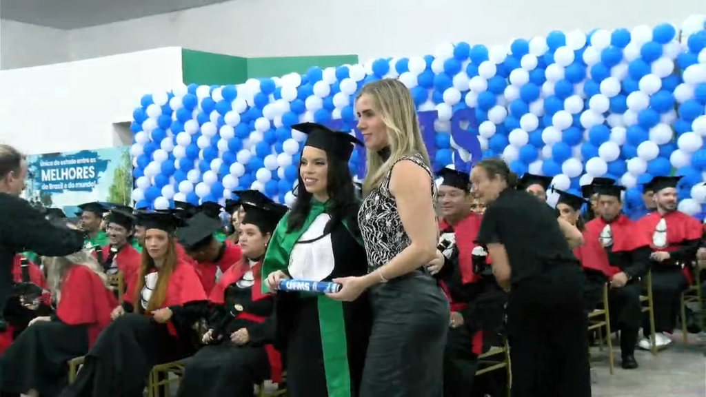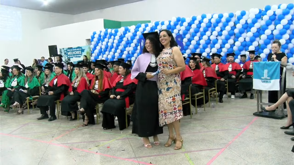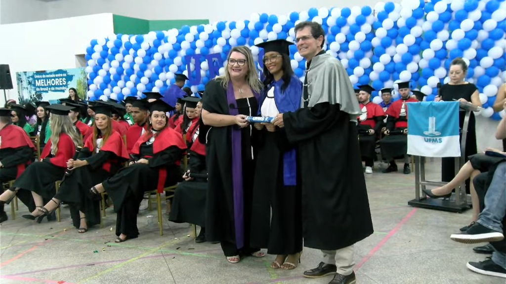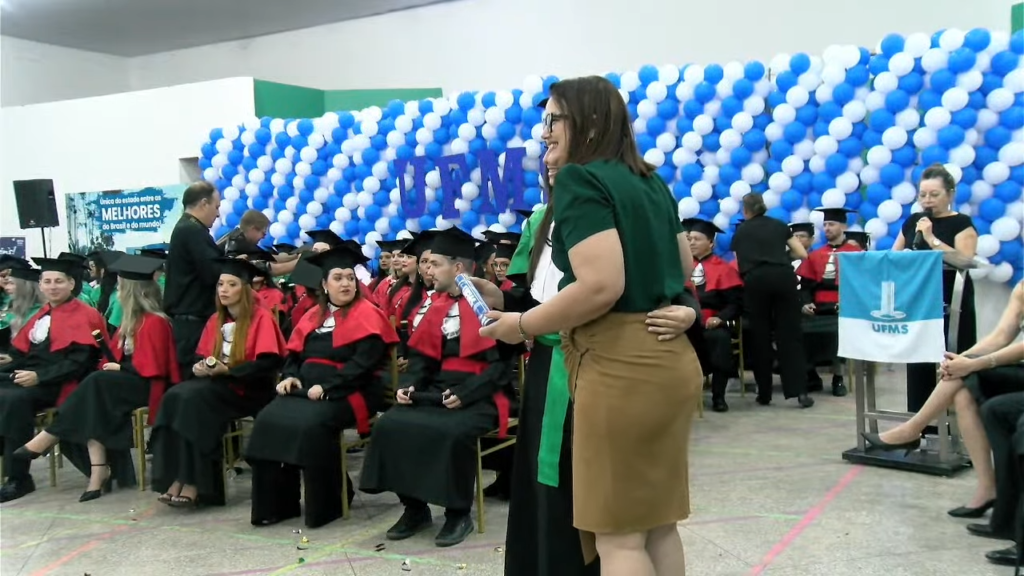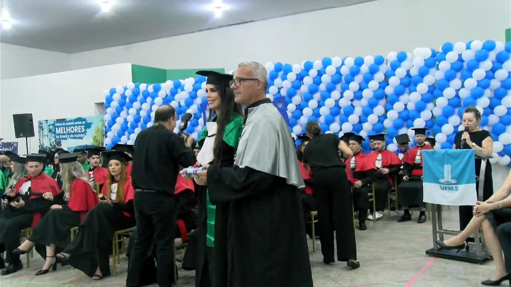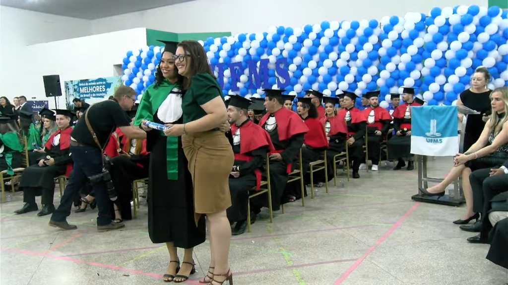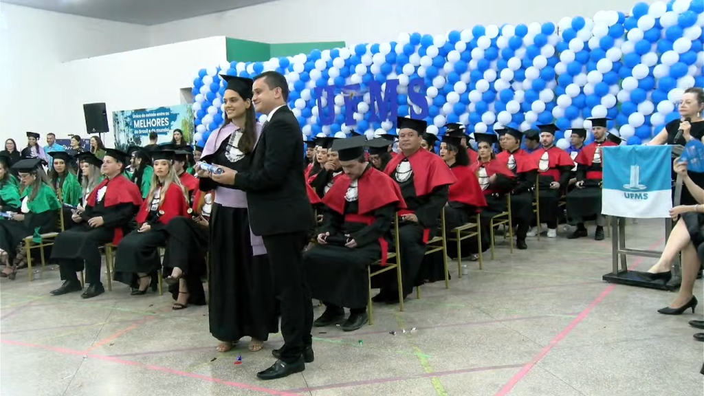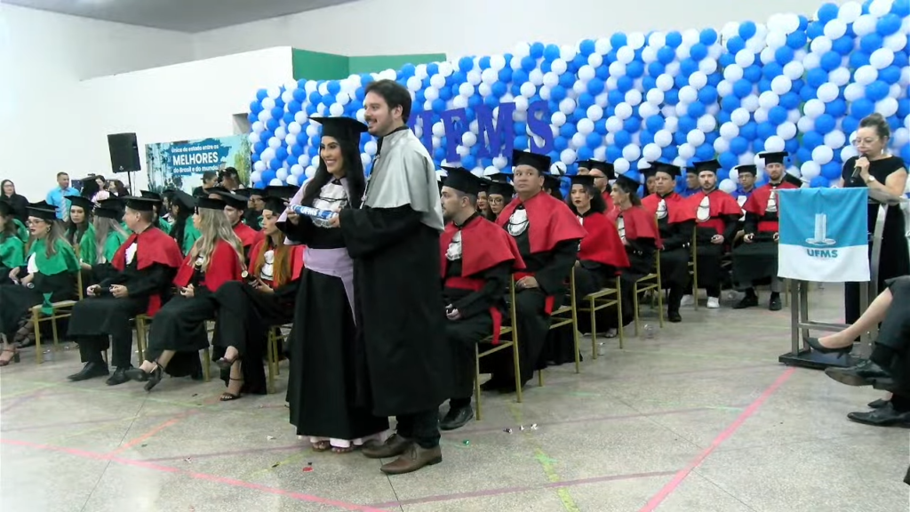 Os estudantes prestaram uma homenagem à estudante Letícia da Silva Camargo, que faleceu em decorrência de um acidente. A família recebeu simbolicamente o diploma da UFMS, em um gesto de respeito e reconhecimento pelo sonho e dedicação da jovem.