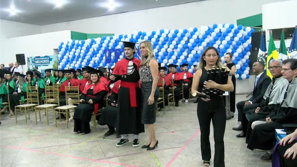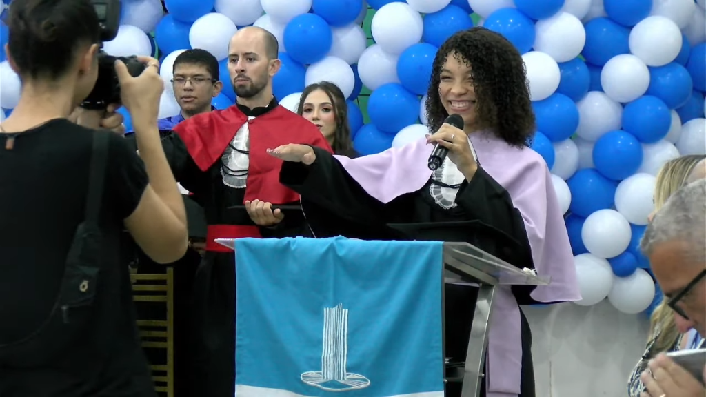 A bacharel em Direito Gislaine Martins Leite falou em nome dos colegas. “Estamos aqui esta noite pela nossa história e pela história de todos aqueles que caminharam conosco: pais, filhos, esposas, maridos, amigos. Todos, de alguma forma, estão presentes nesse momento. E agora, o que vem pela frente? Nosso maior desafio começa hoje. Temos uma responsabilidade com os nossos e com nós mesmos. Enfrentaremos um mercado de trabalho ainda muito desigual, mas que não nos assusta. Vencemos até aqui. E apenas cada um de nós sabe tudo o que enfrentou e o que passou para chegar a este dia. E é por isso que sabemos: nós conseguimos e continuaremos construindo um caminho de vitórias, valorizando cada passo e cada pessoa que caminha ao nosso lado. Porque, se há uma certeza na vida, é que tudo é breve, e é justamente por isso que não esquecemos que, nesta noite de alegria, guardamos também uma dor, porque há entre nós uma cadeira vazia: Letícia Camargo, aluna de Enfermagem, estaria celebrando este momento conosco. […] Deixo o desejo sincero de que continuemos acreditando na força transformadora da educação e na nossa capacidade de construir um futuro mais justo, mais humano e repleto de possibilidades”, discursou.