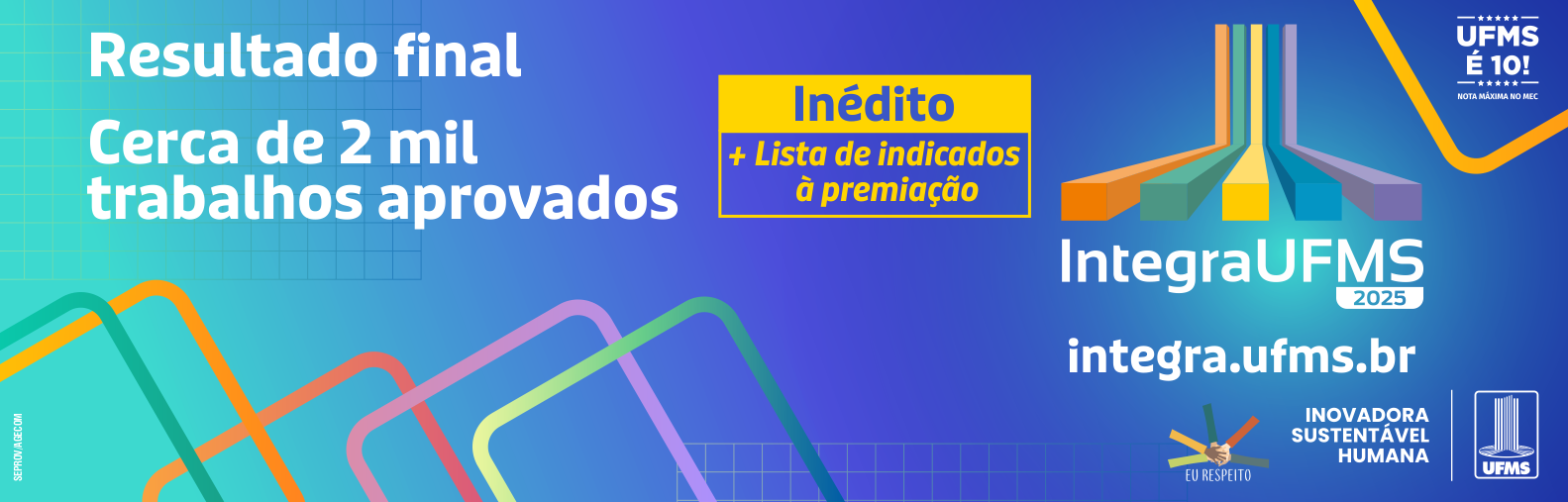 Entre os dias 20 e 25 de outubro, cerca de 2 mil trabalhos serão apresentados por estudantes, servidores e egressos da Instituição durante o Integra UFMS 2025, realizado no Ginásio Moreninho, na Cidade Universitária. O maior evento de ciência, tecnologia e inovação de Mato Grosso do Sul reúne os resultados de programas, atividades e ações institucionais desenvolvidos em todos os câmpus em que a UFMS está presente, no âmbito do ensino, pesquisa, extensão, empreendedorismo, inovação, internacionalização e sustentabilidade. A lista de trabalhos aprovados está disponível aqui.