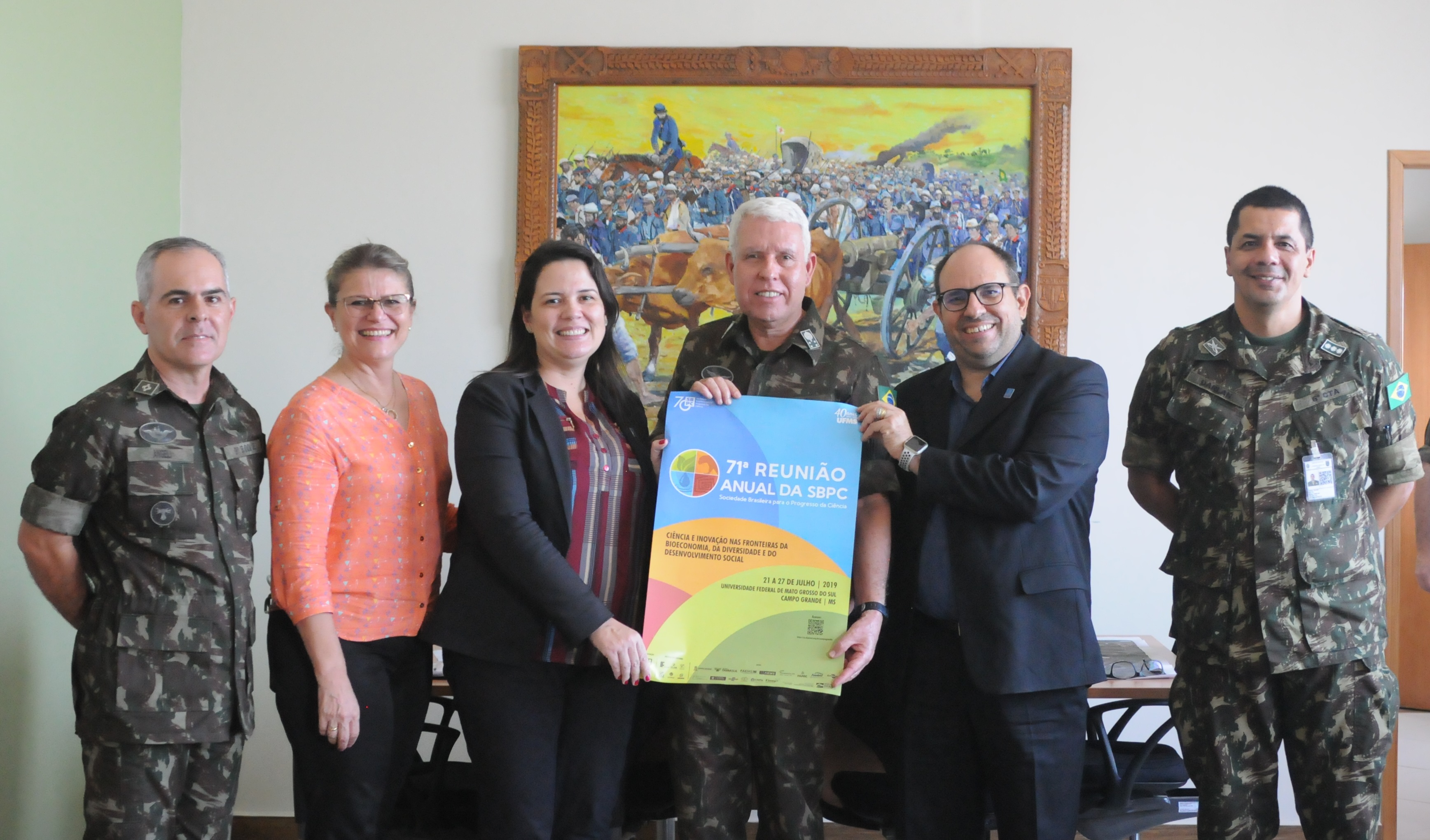 O reitor Marcelo Turine e a vice-reitora Camila Ítavo estiveram hoje no Comando Militar do Oeste (CMO) para convidar oficialmente a entidade para apoiar e participar da 71ª Reunião Anual da Sociedade Brasileira para o Progresso da Ciência (SBPC).