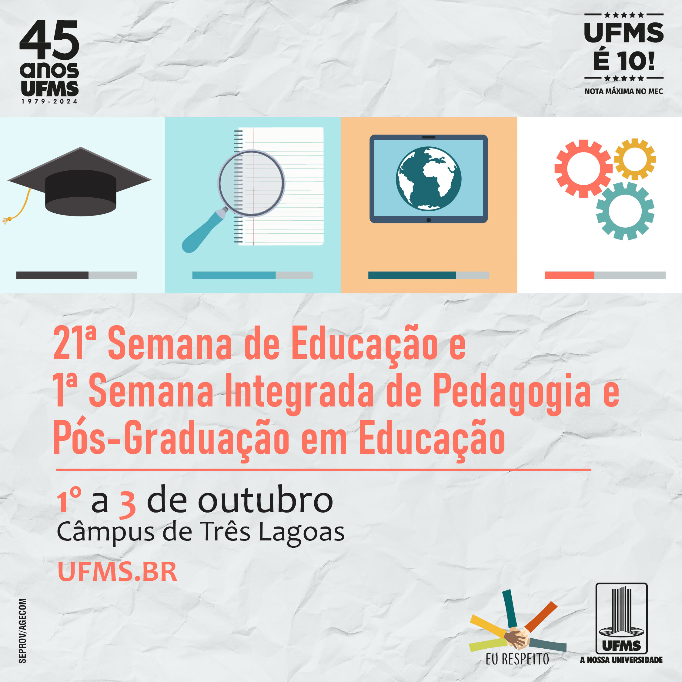 A partir de hoje, 1º, tem início a 21ª Semana de Educação e 1ª Semana Integrada de Pedagogia e Pós-Graduação em Educação no Câmpus de Três Lagoas (CPTL). O evento gratuito, com o tema A educação e os desafios da atualidade: entre estudos, técnicas e saberes, terá palestras com profissionais renomados, mesas de debate sobre a educação escolar contemporânea, atividades culturais, apresentações de trabalho, homenagens a egressos, além de oficinas e minicursos abertos ao público interno e externo.