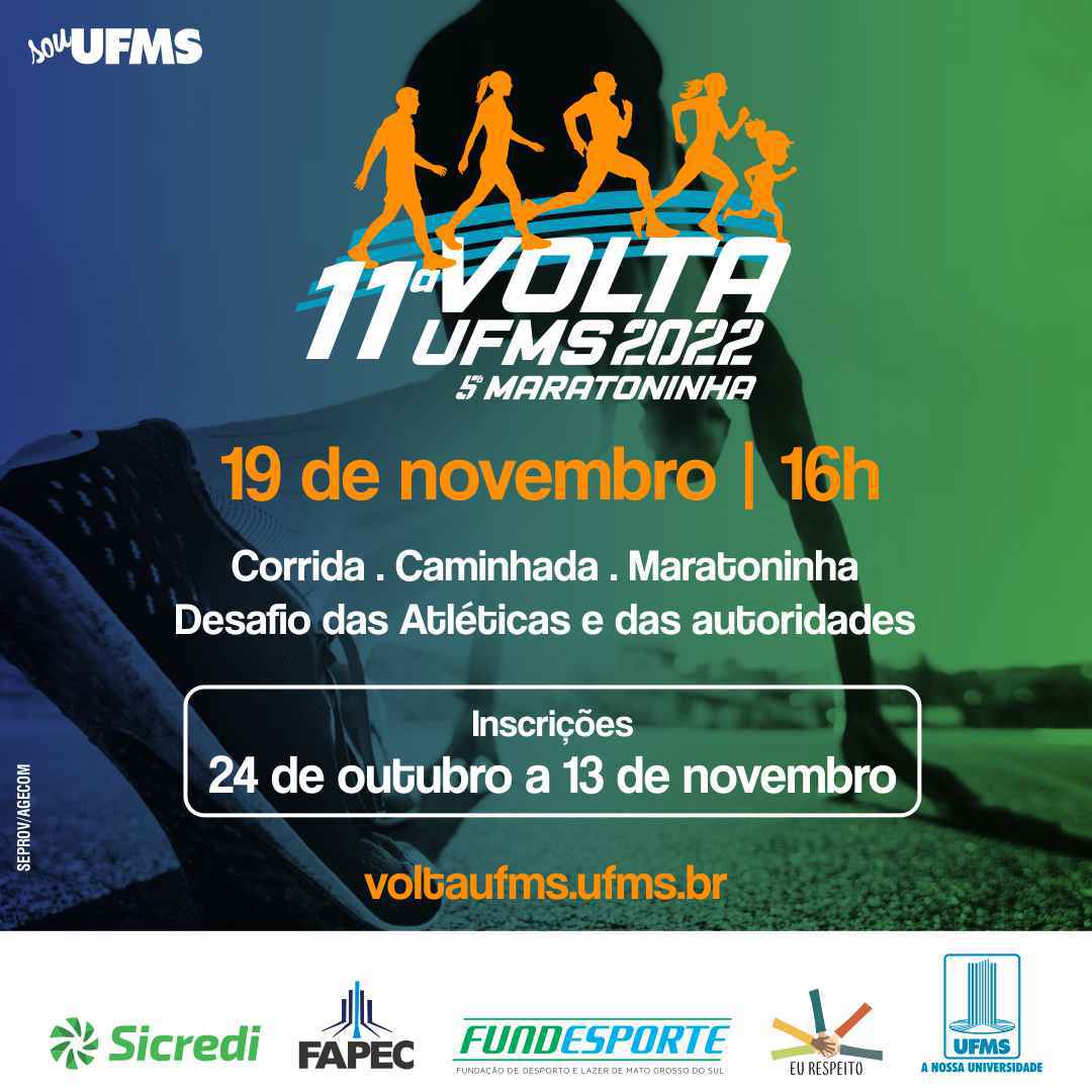 As inscrições da 11ª Volta UFMS começam nesta segunda-feira, 24. O evento será realizado no dia 19 de novembro, às 16h, na Cidade Universitária, e a participação ocorre a partir da doação de 1 kg de alimento não perecível ou de um brinquedo em bom estado de conservação