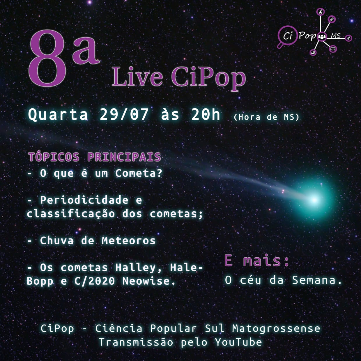 Transmitida pelo YouTube, esta é a oitava live feita pelo grupo, que tratará dos cometas. “Hoje na live vamos abordar a temática dos cometas de forma mais popular e abrangente. Iremos falar, sim, das características físicas e astronômicas desse objeto magnífico, mas também iremos abordar aspectos mais populares e históricos dele. Quais as visões dos povos sobre os cometas? Presságios de guerra? Paz? Coisas boas ou ruins?”, explica Rafael Pereira Silva, estudante do curso de Física e membro do CiPop.