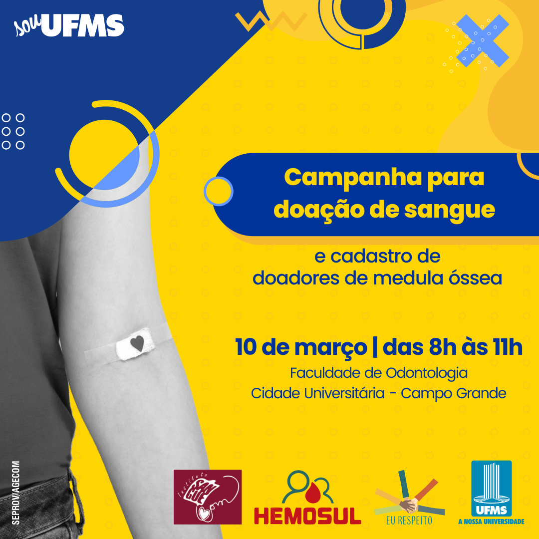 No dia 10 de março, das 8h às 11h, a Faculdade de Odontologia na Cidade Universitária irá sediar uma campanha para doação de sangue e cadastro de doadores de medula óssea. A ação faz parte da Recepção Institucional, da campanha Eu Respeito e é realizada pela UFMS em parceria com o Instituto Sangue Bom (ISB) e Hemosul.