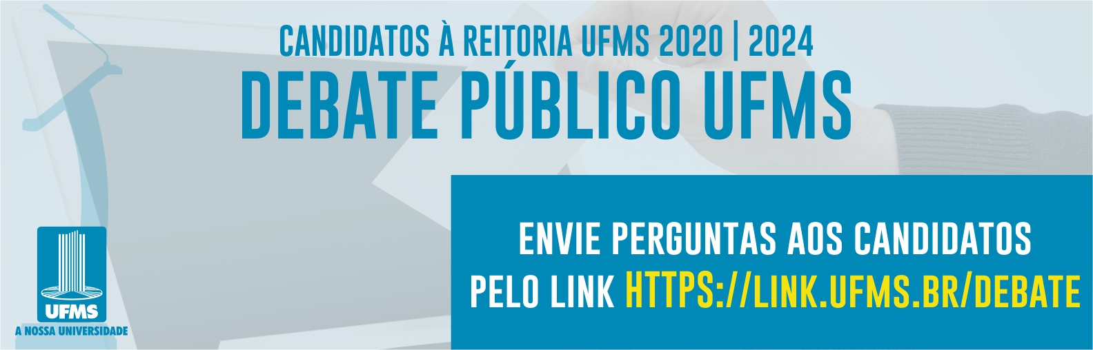 “As regras para o debate se basearam nos limites das ideias e propostas para a UFMS, contidas nos planos dos candidatos para o próximo quadriênio. Entre outros, haverá um espaço importante e fundamental para a comunidade enviar questionamentos a todos os candidatos que responderão a uma série de perguntas sorteadas e o eleitor poderá ter uma visão das propostas para a nossa Universidade”, explica o presidente da Comissão Executiva Central, prof. Henrique Mongelli.