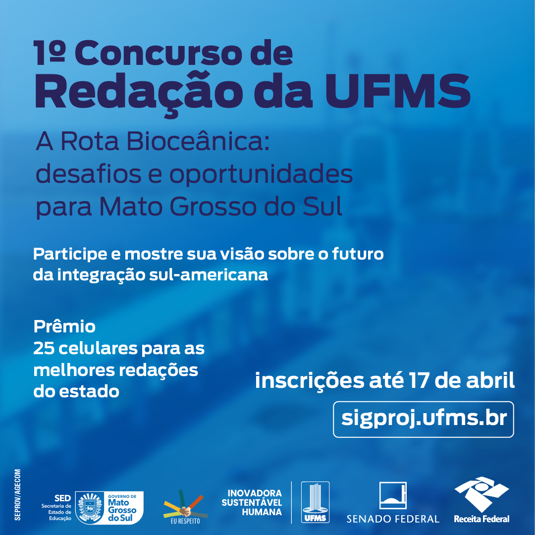 O 1º Concurso de Redação da UFMS irá premiar os 25 melhores textos no tema A Rota Bioceânica: desafios e oportunidades para Mato Grosso do Sul. Realizado pela Universidade com apoio do Senado Federal e da Secretaria de Estado de Educação (SED), as produções podem ser enviadas por alunos do Ensino Médio regularmente matriculados em unidades escolares vinculadas à SED de Mato Grosso do Sul, de qualquer município do Estado. O prazo para inscrições e envio das redações vai até 17 de abril.