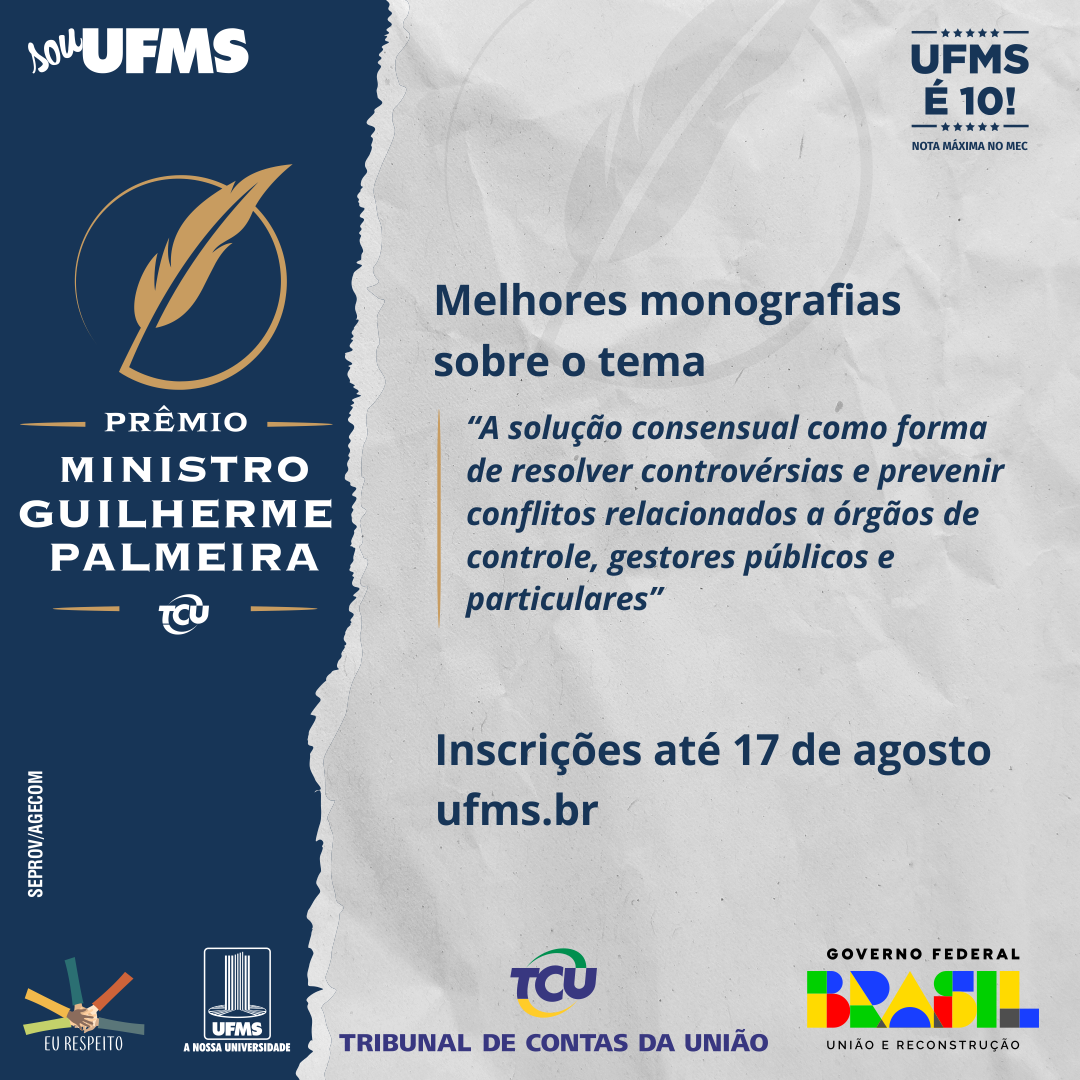 Estudantes de graduação têm até o dia 17 de agosto para a inscrição no Prêmio Ministro Guilherme Palmeira, o concurso nacional de monografias do Tribunal de Contas da União (TCU). Os candidatos podem submeter monografias inéditas sobre o tema A solução consensual como forma de resolver controvérsias e prevenir conflitos relacionados a órgãos de controle, gestores públicos e particulares.