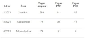 Na área médica, as chances são para mais de 90 especialidades. Na área administrativa, as vagas são para: advogados, administradores, biblioteconomistas, contadores, economistas, estatísticos, publicitários, jornalistas, relações públicas, tecnólogos da informação, arquitetos, engenheiros civil, eletricista, de produção, mecânico e de segurança do trabalho, além da vaga de analista administrativo (qualquer nível superior), e as de nível médio para assistente administrativo, técnico em contabilidade e em segurança do trabalho.