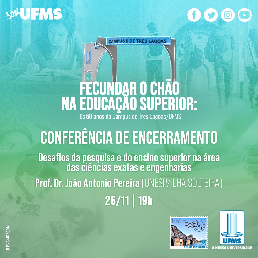 Nesta quinta-feira, 26, será realizada a conferência de encerramento das comemorações pelos 50 anos do Campus de Três Lagoas (CPTL). Desafios da pesquisa e do ensino superior na área de ciências exatas e engenharias será o tema abordado pelo professor João Antonio Pereira, do campus da Unesp em Ilha Solteira.