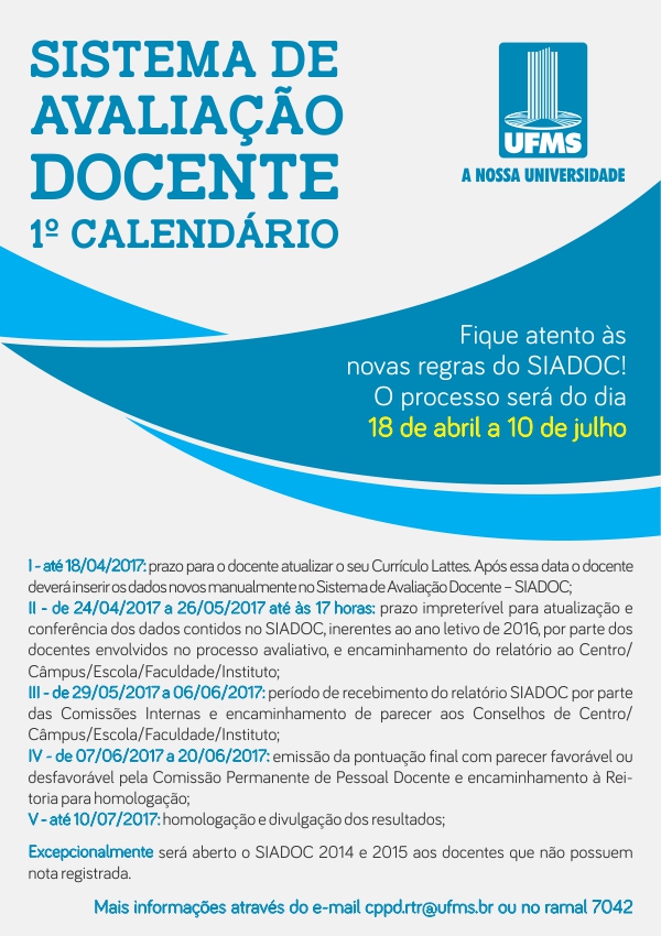 A Divisão de Desenvolvimento e Avaliação (CDR/Progep/UFMS) disponibiliza o calendário com as novas regras do Sistema de Avaliação Docente (SIADOC) 2017. O processo de avaliação acontece entre 18 de abril e 10 de julho, e o prazo para o docente atualizar o seu Currículo Lattes é até 18 de abril.
