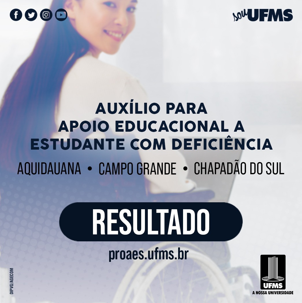 Os estudantes que se inscreveram no processo seletivo para apoiadores educacionais já podem conferir o resultado aqui. Foram oferecidas vagas na Cidade Universitária e nos câmpus de Aquidauana e Chapadão do Sul. O apoiador educacional irá receber um auxílio no valor mensal de R$400 e vigência prevista de seis meses.