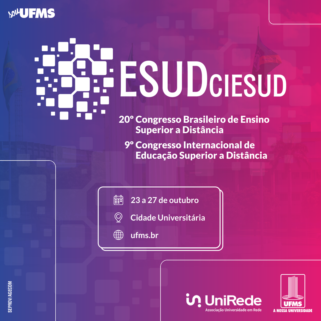 Na próxima segunda-feira, 23, a Cidade Universitária recebe o 20º Congresso Brasileiro de Ensino Superior a Distância (ESUD) e o 9º Congresso Internacional de Educação Superior a Distância (CIESUD), com o tema é Educação a Distância: políticas públicas, gestão, governança e qualidade. Estudantes de graduação, pós-graduação, professores da Educação Básica e demais interessados podem se inscrever na página do evento