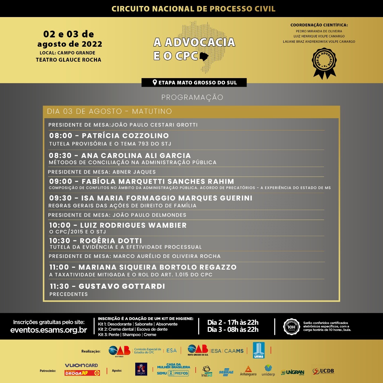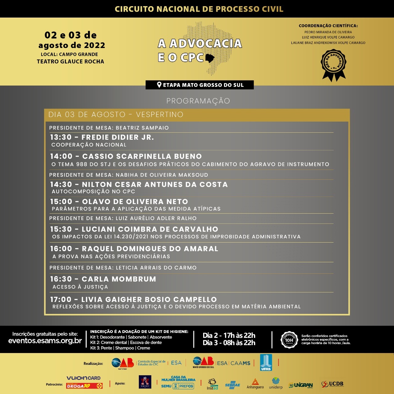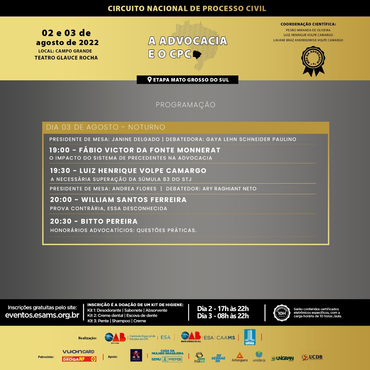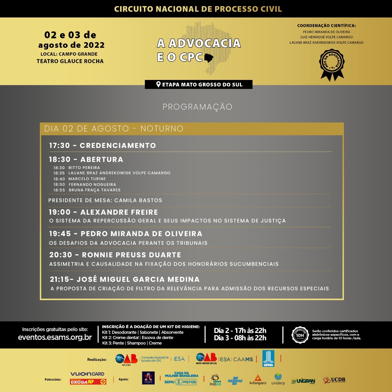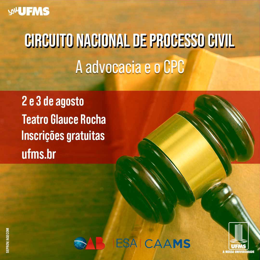 Nos dias 2 e 3 de agosto, o Teatro Glauce Rocha recebe o congresso A Advocacia e o Código Processual Civil, que faz parte da primeira etapa do Circuito Nacional de Processo Civil. O encontro é realizado pela UFMS, pela Escola Superior da Advocacia (ESA), e pela Comissão de Processo Civil do Conselho Federal da Ordem dos Advogados do Brasil.