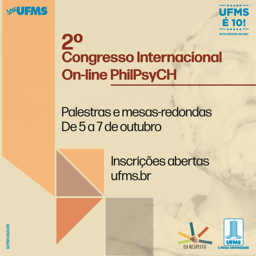 Começa nesta quinta-feira, 5, o 2º Congresso Internacional  PhilPsyCh, com palestras e mesas-redondas. O Congresso segue até o dia 7 e é realizado de forma integrada com o 9º Seminário do Grupo de Pesquisa Subjetividade, Filosofia e Psicanálise da UFMS. Os encontros ocorrem no formato remoto e são abertos a toda a comunidade. As inscrições estão abertas na página