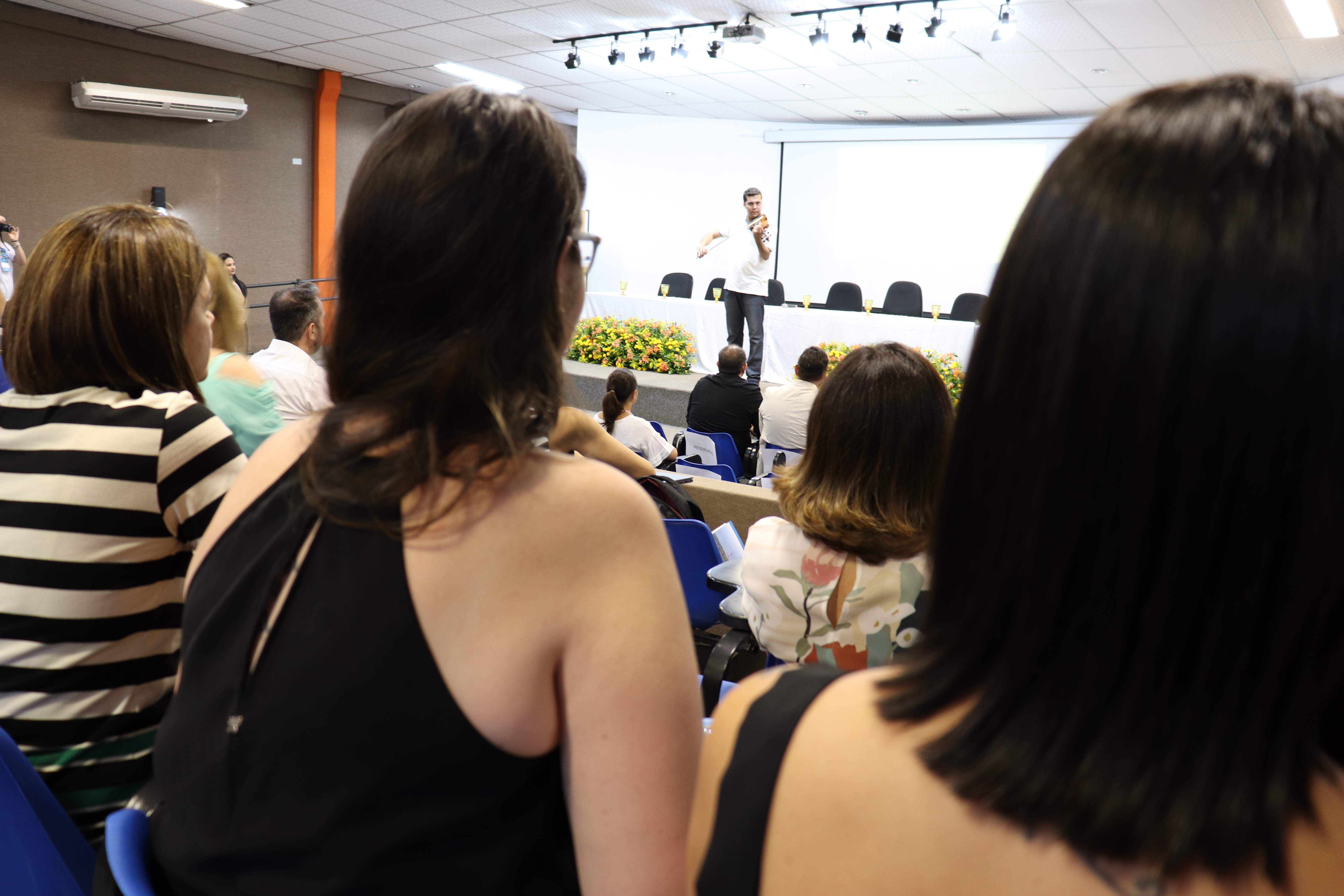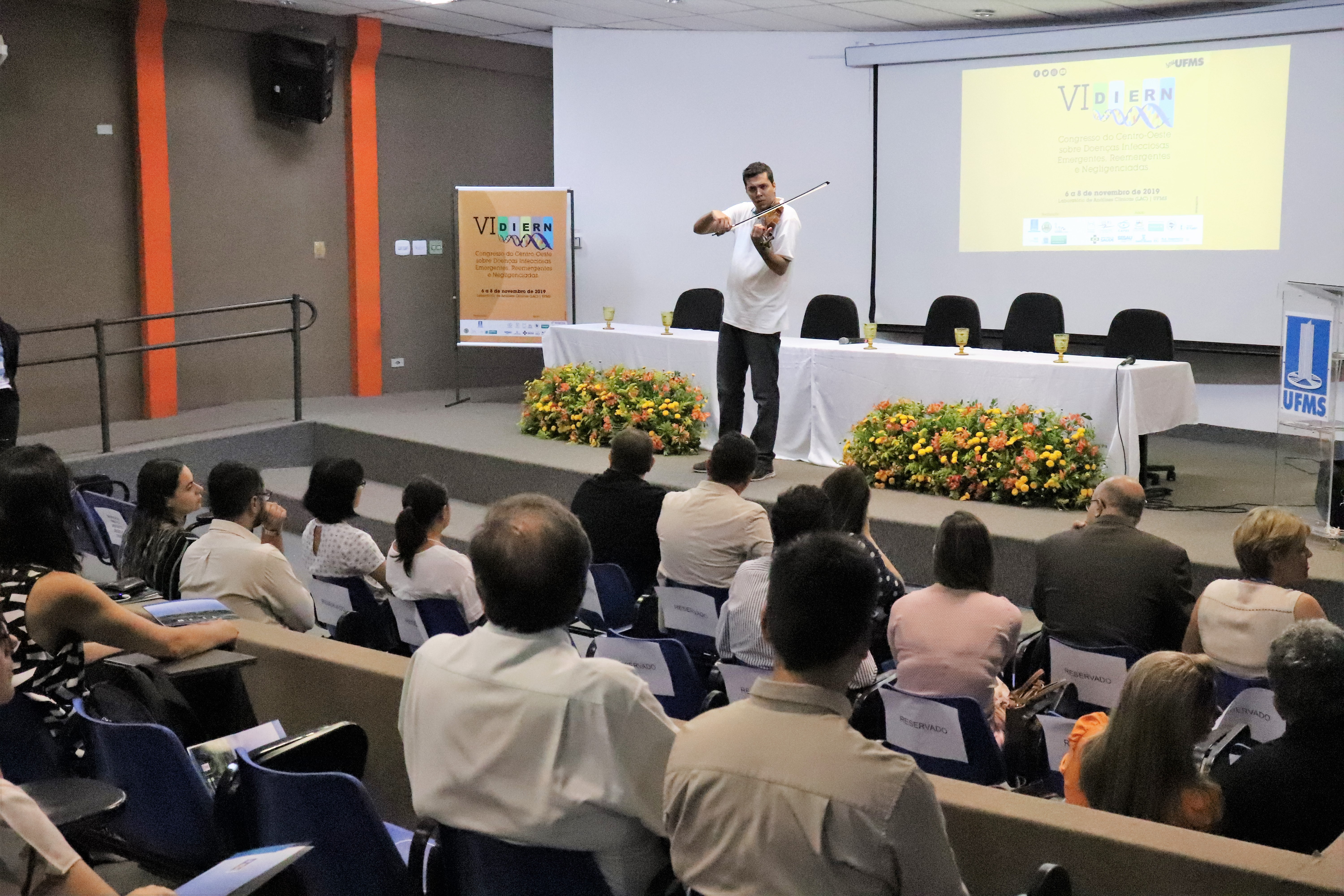 Na abertura, o acadêmico de Música Ismaile contemplou os participantes com uma apresentação de violino. O reitor Marcelo Turine parabenizou a todos pela organização, agradeceu as parcerias e lembrou que “a UFMS está entre as melhores do mundo, graças à competência e empenho dos nossos pesquisadores, professores, técnicos e alunos. Vemos sua dedicação em promover pesquisas e eventos como esse, que consolidam as diversas ações realizadas no dia a dia em prol da formação de recursos humanos qualificados, da geração de conhecimentos e do atendimento aos serviços de saúde”, declarou.