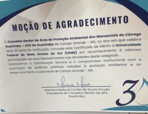 A Universidade e a professora do Instituto de Biociências (Inbio) Alexandra Pinho foram homenageadas pelo Conselho Gestor da Área de Proteção Ambiental (APA) do Guariroba pelo compromisso com a promoção de políticas públicas voltadas à proteção ambiental e ao desenvolvimento sustentável de Campo Grande.