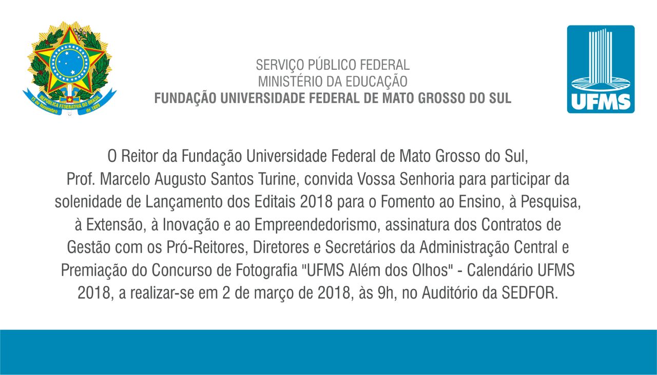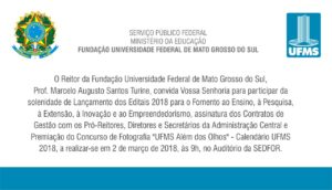 Acontece nesta sexta–feira (2), no auditório da SEDFOR, a solenidade do Lançamento dos Editais de 2018, para o fomento ao ensino, à pesquisa, à extensão, à inovação e ao empreendedorismo, além de assinatura dos contratos de gestão com os Pró-Reitores, Diretores e Secretários da Administração Central e premiação do Concurso de Fotografia da UFMS.