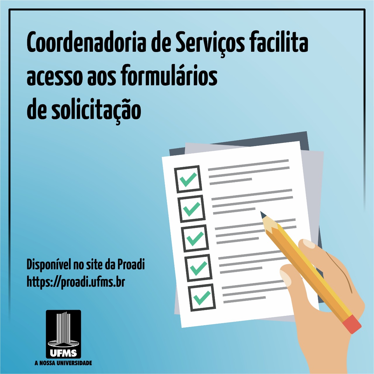 Os interessados em solicitar serviços da Coordenadoria de Serviços podem encontrar todos os formulários necessários no site da Pró-Reitoria de Administração e Infraestrutura (Proadi), pelo link proadi.ufms.br/coordenadorias/servicos/.